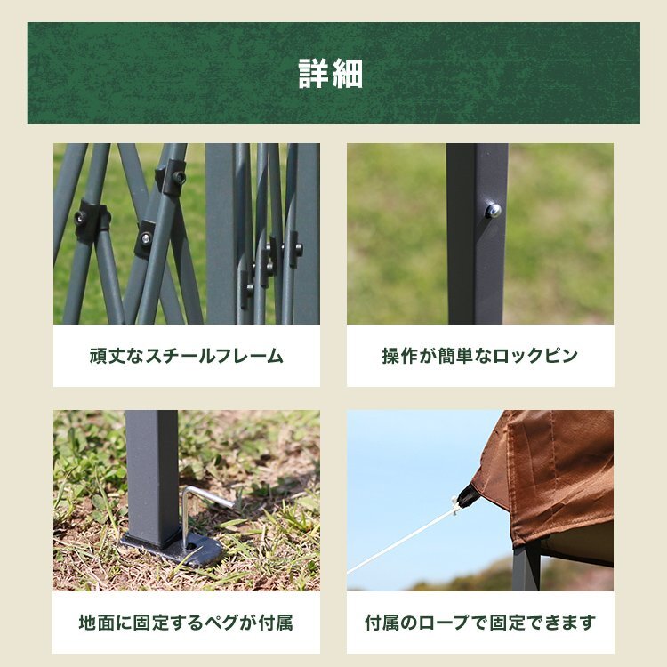 コンパクトなサイズ200×200cmのワンタッチタープテントです。 組み立てはワンタッチで簡単! 大人2人で持ち上げてゆっくり広げるだけ! フレームは強度で耐久性のあるスチール製を採用! アルミ製より少し重いですが、強度で安定性があります!! 急な雨が降っても安心の撥水加工が施されており、大人数のバーベキューやスポーツ観戦、アウトドア、休憩所にぴったり。 持ち運びに便利な専用収納バック付き! 【商品仕様】 カラー:グリーン 商品サイズ(約): ・使用時:幅200×奥行200×高さ165~250cm ・収納時:幅120×奥行21×高さ21cm 材質:スチール、ポリエステル 重量(約):11kg 【商品内容】 タープテント本体 ロープ ×4 ペグ ×8 専用収納ケース |