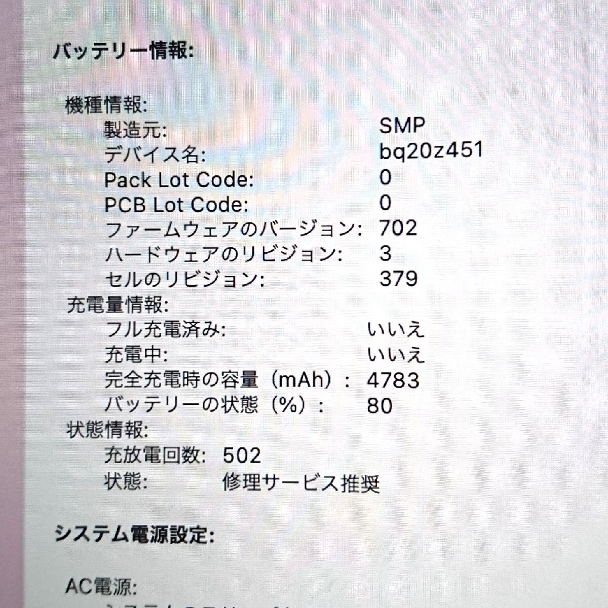 ※バッテリーは膨張ぎみで、修理サービス推奨と表示されます。