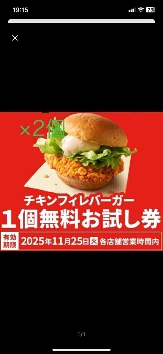 | 商品名稱 : | お試しバーガークーポン2個分 チキンフィレバーガー ケンタッキー 有効期限 11/25 |