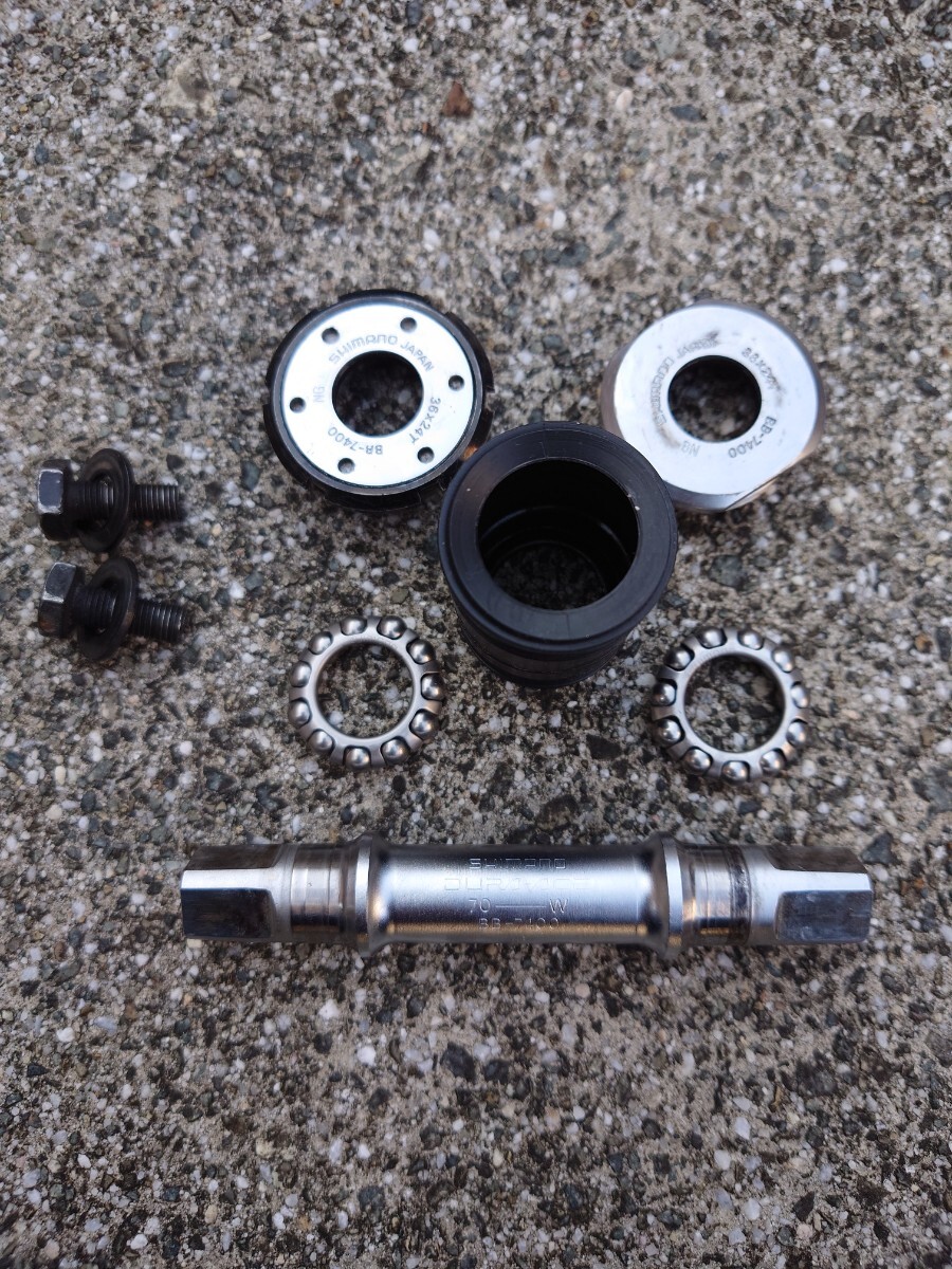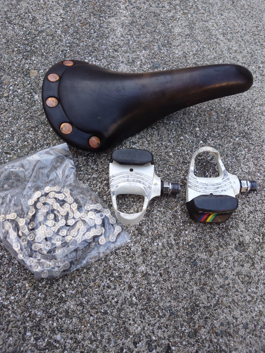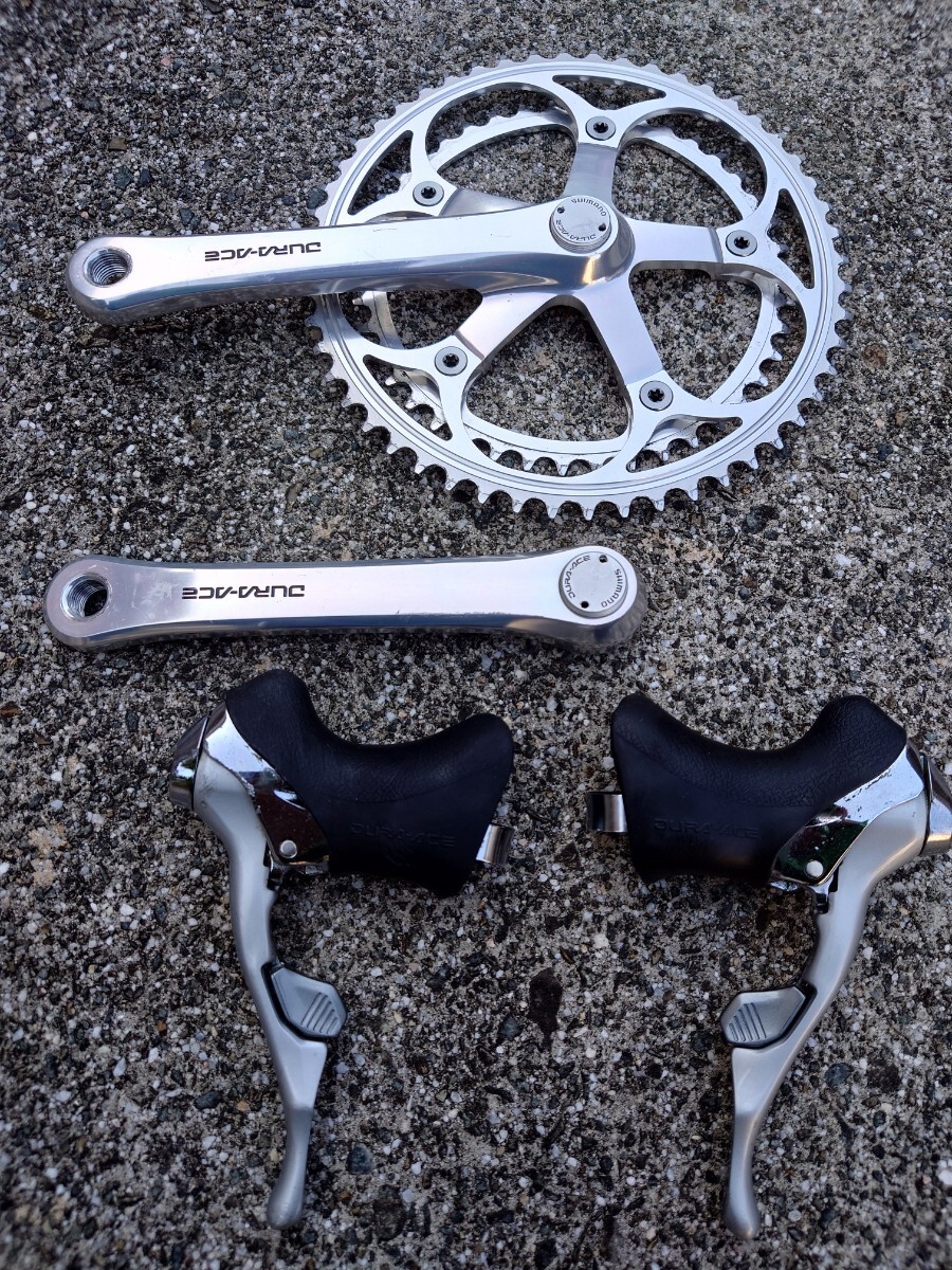 体を悪くしてしまい20年程、乗らずに室内保存しメンテナンスだけはしていました。各所には傷や腐食は有るものの、この年式のパーツにしてはかなり綺麗な部類に入ると思います。レバーは、ST7400クランクFC7402 170 BB7400イタリアンサイズ ブレーキBR7403 フロントディレーラー直付け FD7403 リヤディレイラーRD7402 チェーンCN HG90 ペダルPP96ワールド限定モデル ホイール手組み前後デュラエースホイール、チューブラーマビックGP4 8速SIS(STIレバー対応8速ハブで10速まで使えるハブです)デュラエース8速ギヤスプロケットがついています。シートはサンマルコリーガルのカンガルー皮の物で約30年くらい前の物です本革ならではの、ヒビ?みたいなんがありますが、使用には全く関係なくしっかりしております。ビンテージバイク組むなら後は消耗品やハンドル含有安全氣囊的方向盤,無法協助運送購買,若無含安全氣囊,按下確認即可下標。 シートポスト位で組めると思います。 出品にあたり近くのダムまで10キロほど走りましたが不具合は有りませんでした。ただ古いパーツの為いくら走行が少ないとはいえ思わぬ不具合が出るかもしれません。ノークレームノーリターンでお願いします。 知りたいことがあれば何なりと質問してください。 取りに来ていただけるなら、兵庫県神戸市又は職場の兵庫県尼崎市なら手渡せます。 以下は即決時8万円で落札頂けた時の御礼品とします。 即決価格で落札していただけると、ホイールもうワンセット レース用にと同じデュラエース8速SISのハブに歯数の小さいクロスギヤのスプロケットがついた手組ホイール前後(初期フレを出すために数キロ使用しただけで押し入れの肥やし) デュラエースの新品チェーンCN-7401 未開封新品のシマノ純正品の7400専用のSTIブラケットカバーもお付けします。中古品の53歯のチェーンリングも付けます。他7400関係の物有れば入れます。 >