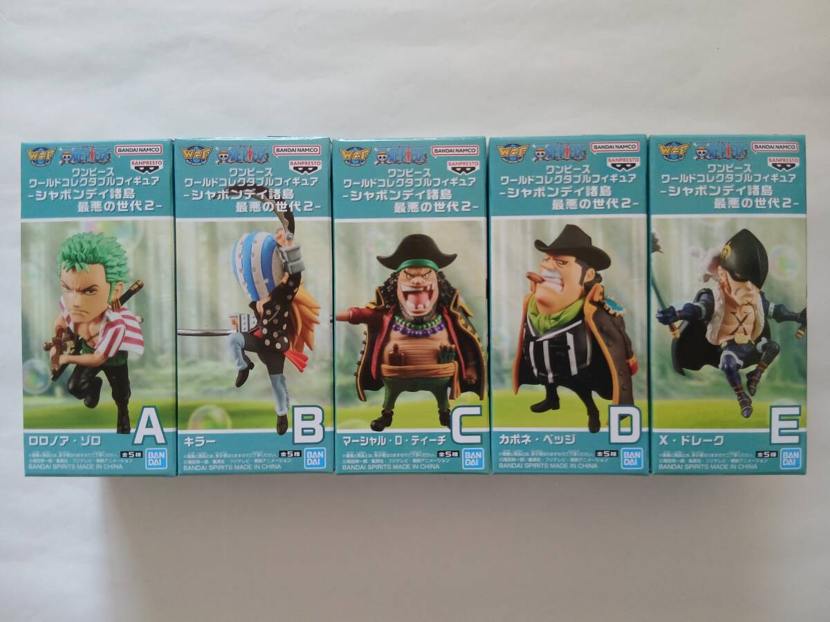 ■商品説明 ☆ ワンピース ワールドコレクタブルフィギュア-シャボンディ諸島 最悪の世代2- 5種セット 1.『 A:ロロノア・ゾロ 』・・・1個 2.『 B:キラー 』・・・1個 3.『 C:マーシャル・D・ティーチ 』・・・1個 4.『 D:カポネ・ベッチ 』・・・1個 5.『 E:X・ドレーク 』・・・1個 全5種セット ※新品・未開封 ※国内正規品
