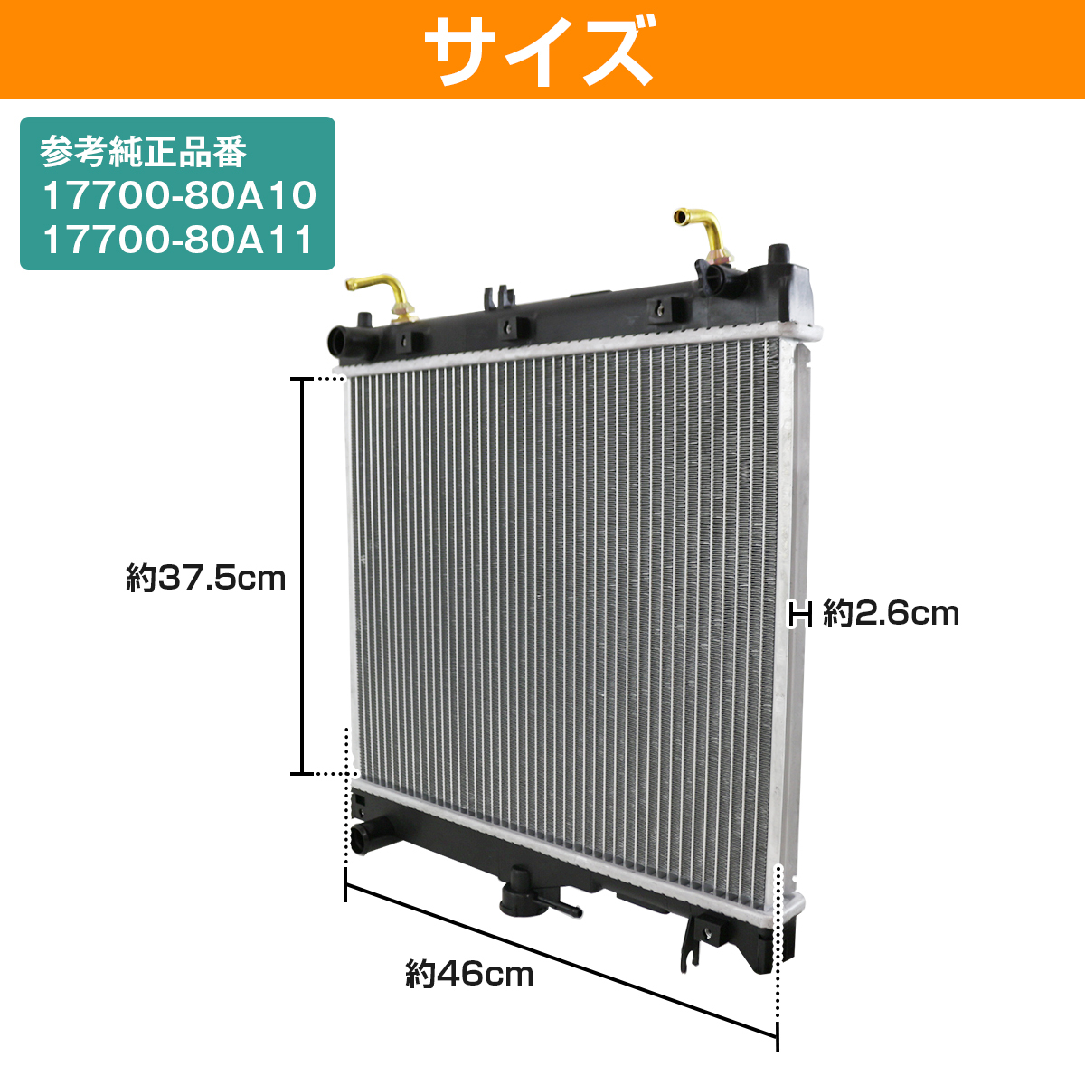 商品内容 【セット内容】 ラジエーター×1個 【適合品番】 17700-80A10 / 17700-80A11 / 17700-81A11 【参考適合車種】 メーカー:スズキ 車種名:ジムニー 型式:JB23W 備考:A/T ※適合車両は目安です。 年式、仕様などにより適合品が異なる場合がございます。 ご注文いただく前に、 必ず純正品番号から適合をお確かめください。 なお、弊社でも適合確認を承っております。 【お問い合わせフォーム】またはお電話にて車台番号をお知らせください。 なお、車種やメーカーによっては回答できないものもありますのでご了承ください。