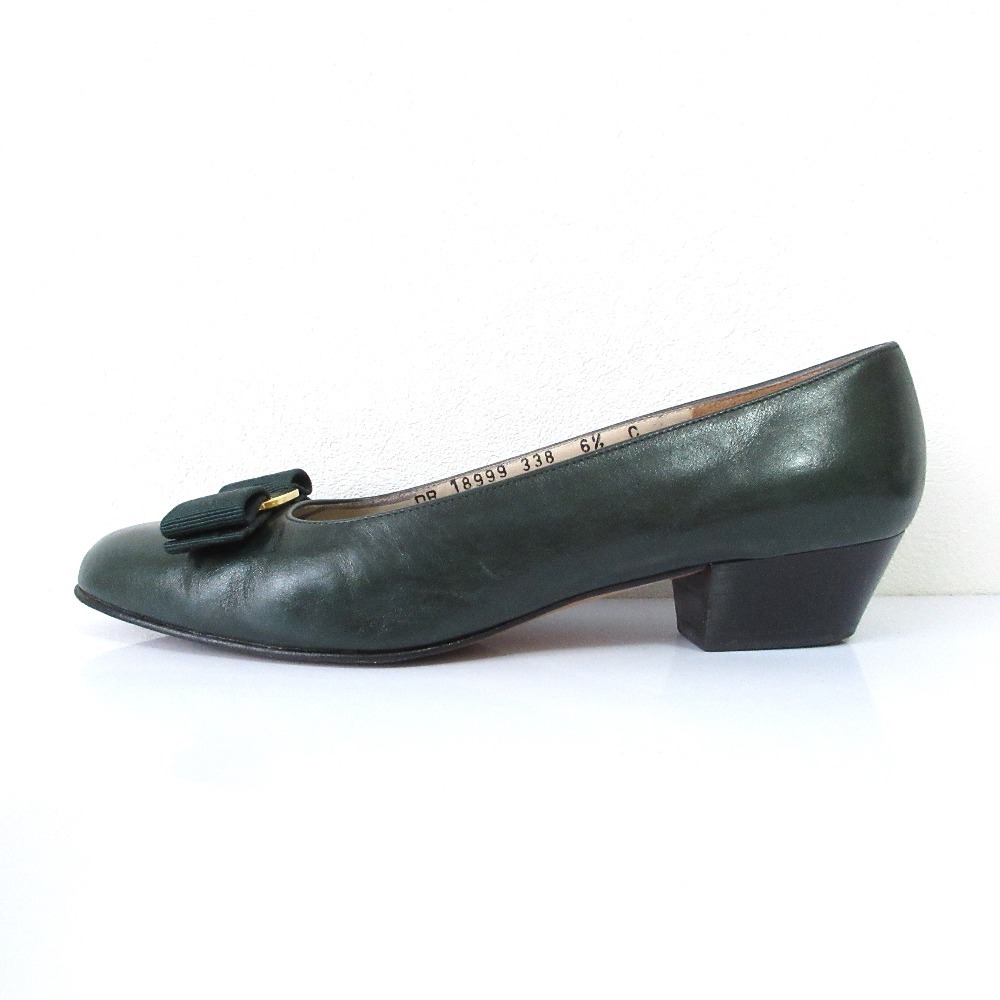 商品名:Salvatore Ferragamo サルヴァトーレフェラガモ ヴァラ リボン ラウンドトゥ ローヒール パンプス 6.5 24cm相当 グリーン