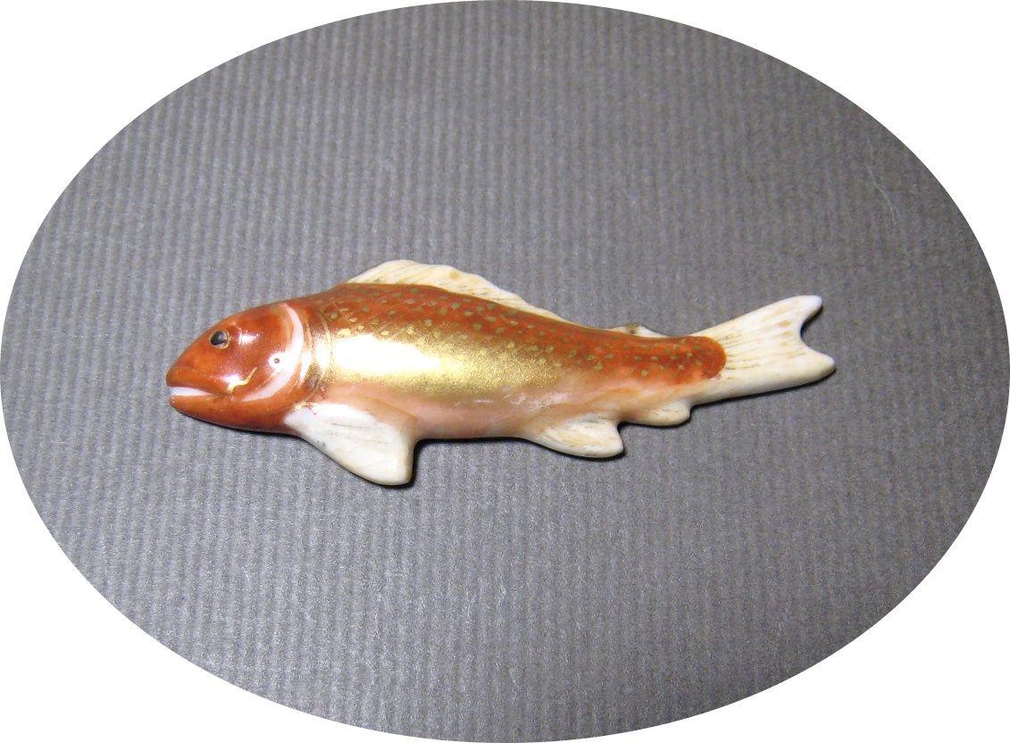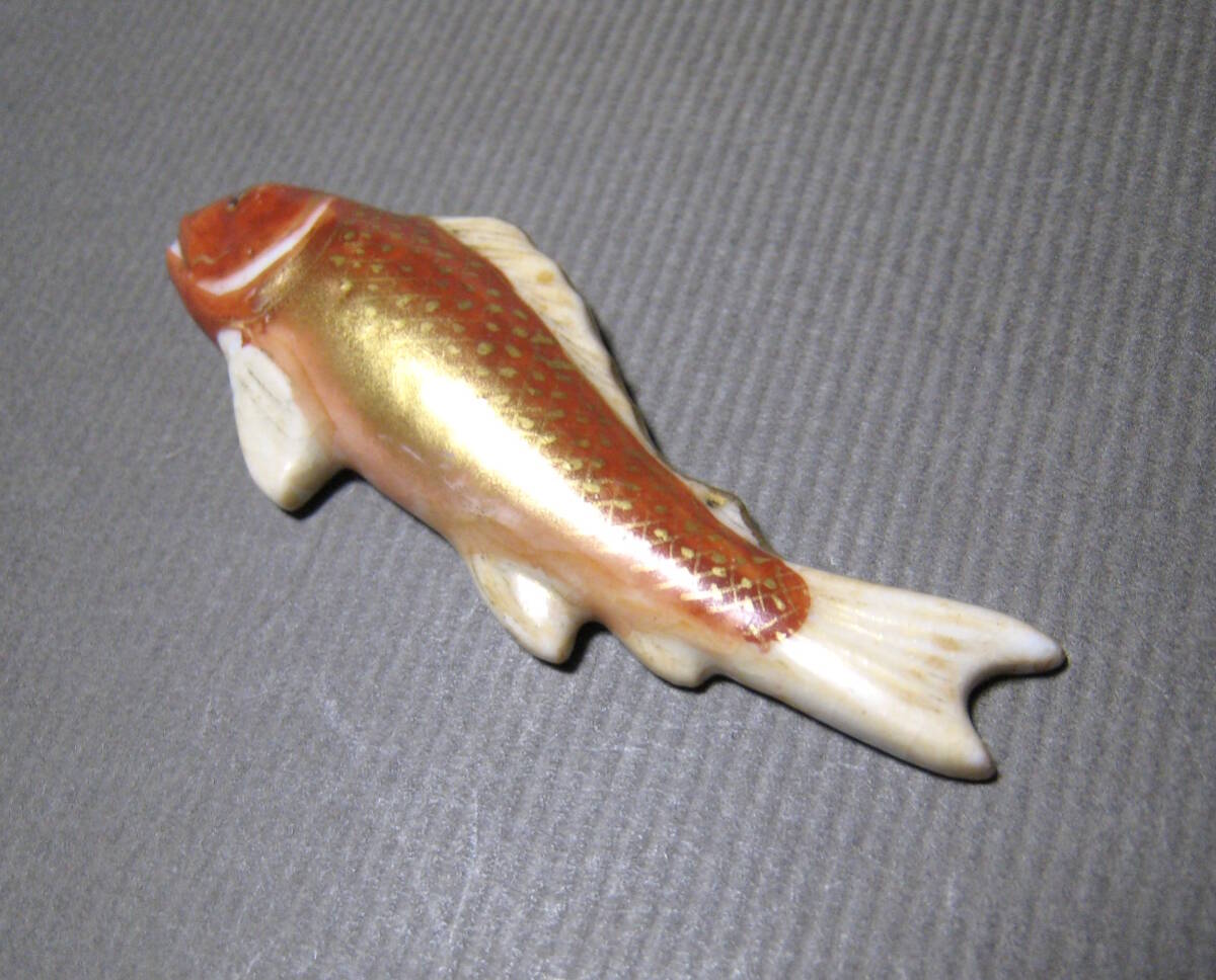 艶やかで美しい目を引く大振りの魚(鯉?)の帯留です。 確認したところ大きな破損はございませんでしたが、裏面等に製造過程の窯傷(くっつき、彩色飛び等)がございます。その他、小傷、汚れ等も多少ございます。