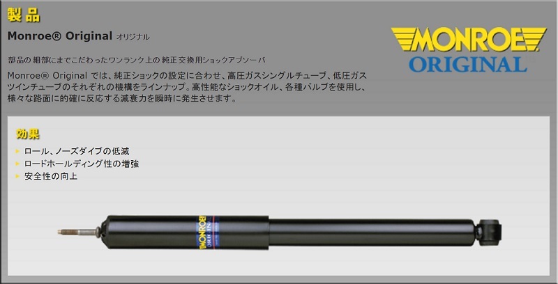 | 商品説明 | 世界屈指のショックメーカーであるモンロー社は、 誰もが認めるライドコントロール製品のエキスパートです。 100年近く前に世界で初めてショックアブソーバーを世に送り出してから、 高い技術と豊富なノウハウにより、世界をリードしています。 最近のマツダ車に純正採用されており、 日本でも着実にファンを増やしています。 豊富なデータと職人の感性によって紡がれるその絶妙な減衰力特性は、 "モンローマジック"とも評されます。 そのしなやかなセッティングにより、 クルマの走行安定性の向上はもちろんの事、 安全性、乗り心地をもワンランク上へと向上させるでしょう。 出品内容は、以下となります。