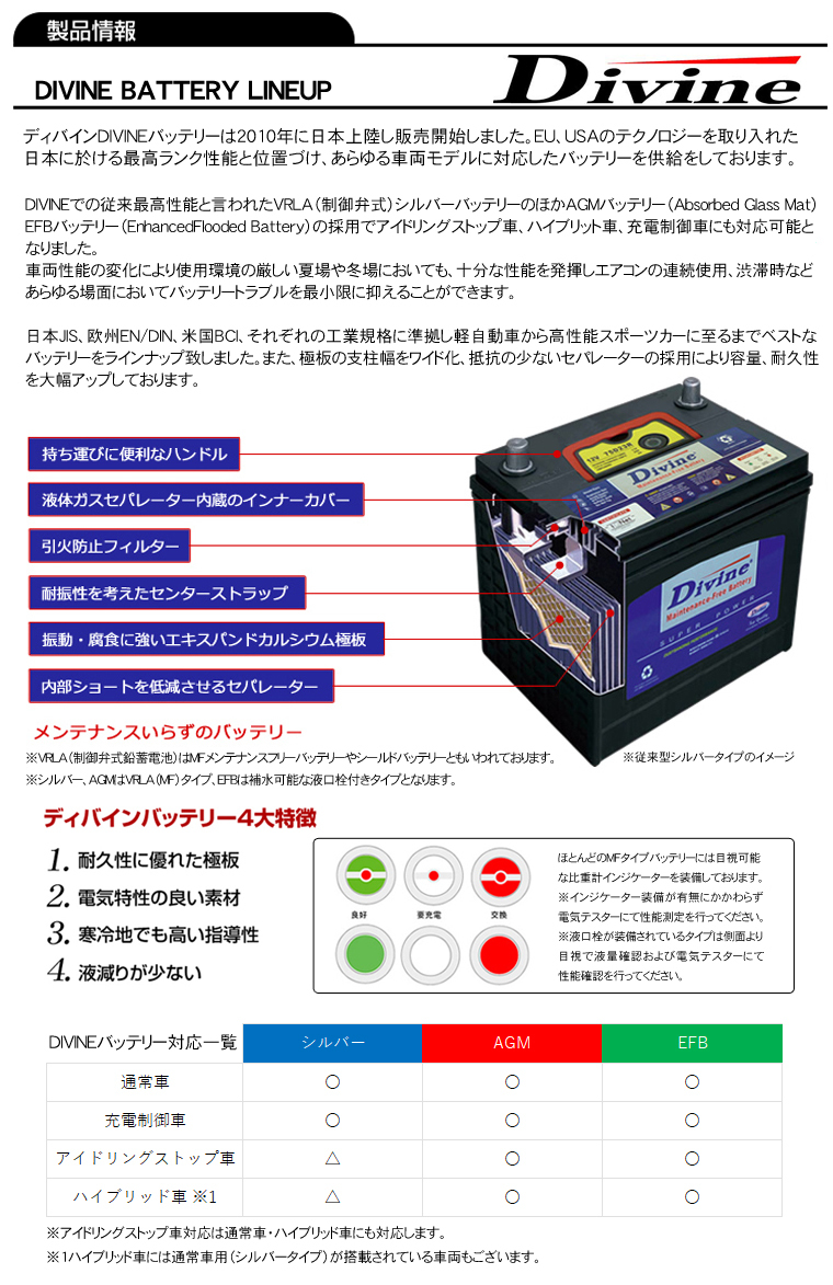 ![]() [商品詳細] ■DIVINE AGMバッテリー ■STOP&GOを繰り返すアイドリングストップ車に対応、高コストのガラスマットで内部抵抗を抑え初期電流を大幅UP 充放電サイクル数を増加したトップクラスのバッテリーです。 ■出荷前に電圧およびCCA測定を実施しております充電済みバッテリーで到着後に直ぐにご使用頂けます。 ■バッテリー要項表(サイズ・重量は目安となります)