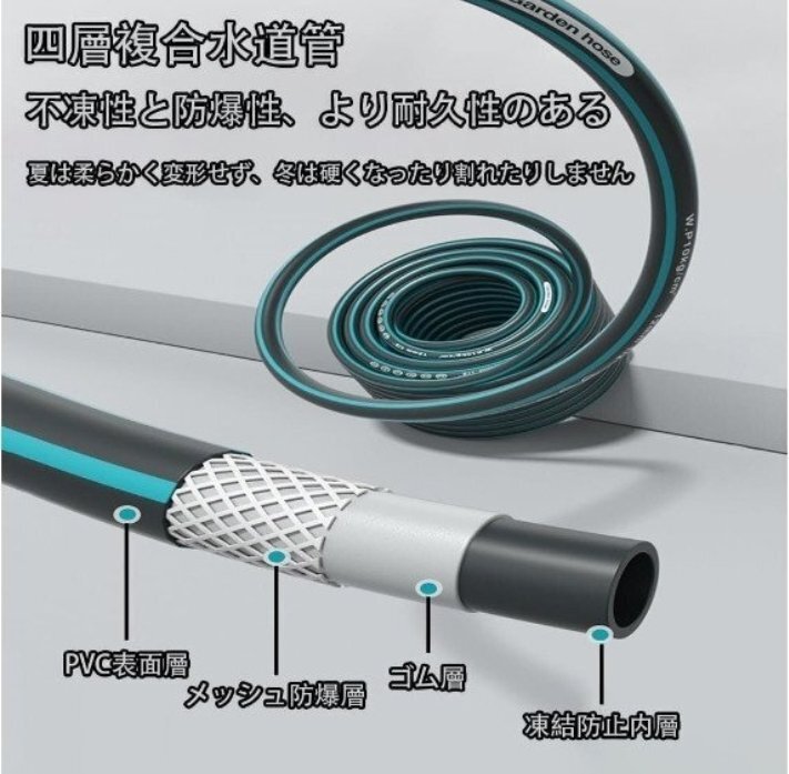 【高品質複合ホース】:多層複合材料で作られており、夏は柔らかくて変形せず、冬は硬化してひび割れず、優れた高温耐性と耐寒性を備えています。また、超高柔軟性、強力な弾性を持ち、変形しにくく、耐圧性、耐腐食性にも優れています。