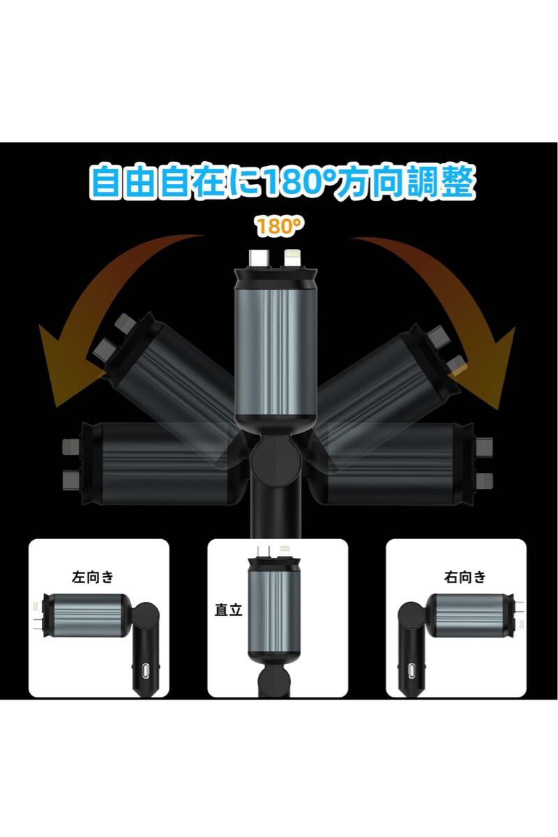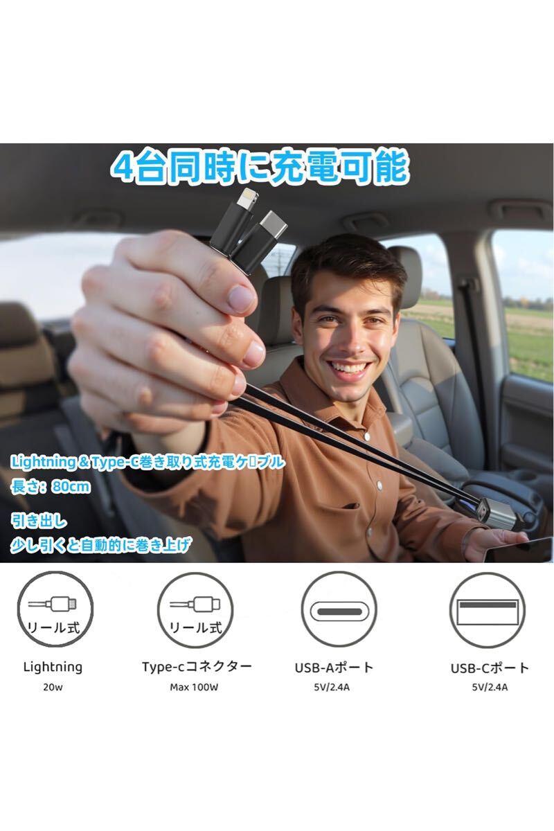 【4機器同時充電対応】USBポート2基と巻き取り式ケーブル2本を装備し、最大4台のデバイス同時充電が可能。家族旅行時の電子機器充電に最適なだけでなく、車所有の方への贈り物としても最適です。Android/iOSシステムに対応し、iPhone 16 Pro MaxなどのType-Cデバイス高速充電を実現し、従来にない車載充電ソリューションを提供します。