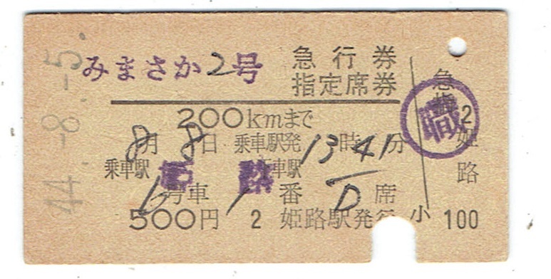 | 《硬券 急行券》「みまさか2号」 昭和44年 姫路駅 | |