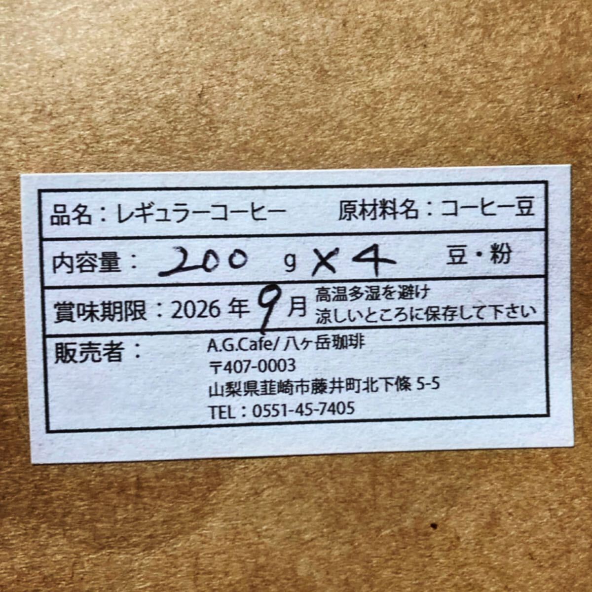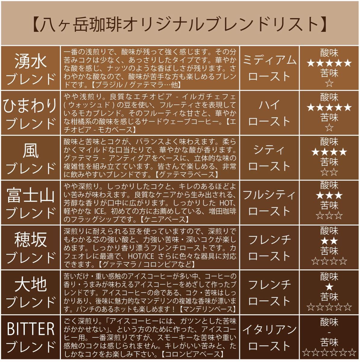 【最重要】→粉の状態 粉に挽いてご用意します! 豆の状態をご希望の場合は、ご購入後にコメントにご記入下さい。コチラからもコメントしますが、お返事のない場合は全て粉に挽いて発送いたします…その場合の返品やクレームには、お応え出来ませんorz 【商品内容】 自家焙煎スペシャルティコーヒー ブレント100g×5種類 ひまわりブレンド (100g) ハイロースト やや浅煎り。良質なエチオピア-イルガチェフェ(Q84.50)の豆を使用。フルーティな甘さと、華やかな酸味を感じるモカブレンドです。【エチオピア-モカベース/ウォッシュド】酸味4苦み2 風ブレンド (100g) シティロースト 酸味と苦味とコクが、バランスよく味わえます。柔らかくマイルトな口当たりで、華やかな酸が香ります。非常に飲みやすいブレンドです。【グァテマラベース/ウォッシュド】酸味3苦み3 富士山ブレンド(100g) フルシティロースト やや深煎り。しっかりしたコクと、キレのあるほどよい苦みか味わえます。良質なケニアから生み出される、芳醇な香りが口中に広がります。【ケニアベース】酸味2苦み4 大地ブレンド(100g)フレンチロースト 苦いだけ・重い感触のアイスコーヒーが多い中、コーヒーの香り・うまみが味わえるアイスをめざして作ったブレンドです。パンチのあるホットも楽しめ、後味に魅力的なマンデリンの複雑な香味が漂います!【マンデリンベース】酸味1苦み5 季節のブレンド〝韮崎四季巡り〟から1種類(100g)在庫状況からお任せでお願いします 春→シティ/ペルーベース サマー→フレンチ/エチオピア(ナチュラル)ベース オータム→ミディアム~ハイ/コスタリカベース ウィンター→フルシティ~フレンチ/タンザニアベース 珈琲豆→店頭販売用の正規品 フレッシュな状態でご用意いたします!ある程度多めの量で焙煎した方が、安定して上手く仕上がるので…店頭の在庫調整ですが、正規品です!! 梱包材(箱など)→アウトレットの可能性あり 珈琲豆の袋/商品ラベル→アウトレットの可能性あり…コストカットにご協力下さい。 故に…キフトには不向きですorz 【最後に…】 店頭価格からお安く設定した、福袋的な商品です…楽しみとして、ご利用下さいww素敵な珈琲タイムを☆ 豆の状態をご希望の場合は、要コメント! >