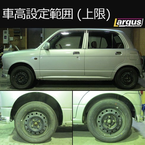 | スペースが狭く、ストロークの確保が困難な軽自動車の為に新たに開発されたSpecK。LARGUSではこれまでの豊富な開発経験を元に、乗り心地と車高調整幅のどちらも犠牲にする事なく、SpecSと同等の性能を持った軽自動車用の車高調を開発しました。 |