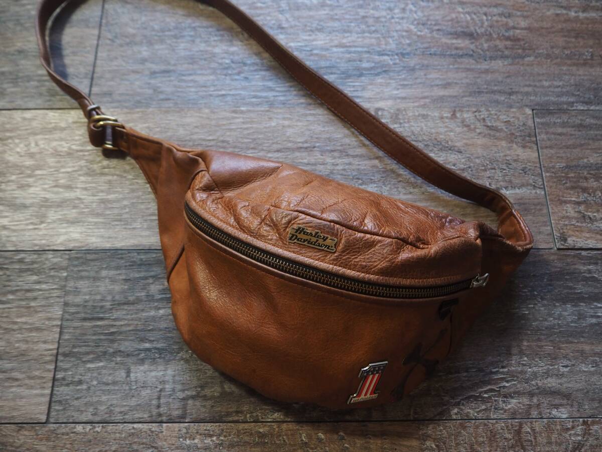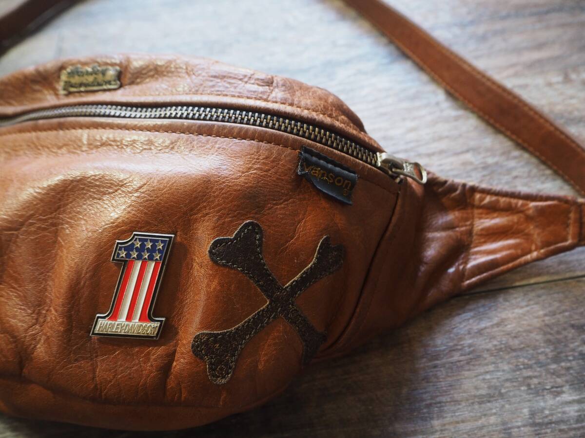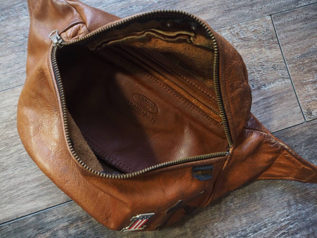 こちらはバンソン VANSON x BACKDROP 別注定番 ウエストバッグです。 バンソンレザーお馴染みの重厚な牛革を贅沢に使用。ウエストバッグやボディバッグと2WAYでお使い出来ます。 収納は本体の端まで十分にお使いが出来、見た目以上の収納力です。 オリジナルのブラックボーンをデザインに、パターンが立体になっておりライディングシーン等、ストレスなくお使い出来ます。 VANSON x BACKDROP レザーウエストバッグ/ファニーパック ブラックボーン 素材 牛革 オーバルパッチ、オリジナルブラスジップ使用 MADE IN USA 実寸 本体 ベルト付け部-ベルト付け部 44.5cm 縦 15cm マチ 8cm コンディション レザーは端部に適度なスレこそありますがアジがあり、通常のご使用に支障ありません。カスタムでハーレーダビッドソン・ピンバッジを付けています。 ジップ完動、内部目立つ汚れ等ありません。又お手入れ済です。 ピンバッジは取り外しも可能ですがNO.1は希少品ですのでこのままでご使用がおすすめです。 宜しくお願い致します。 | ||||