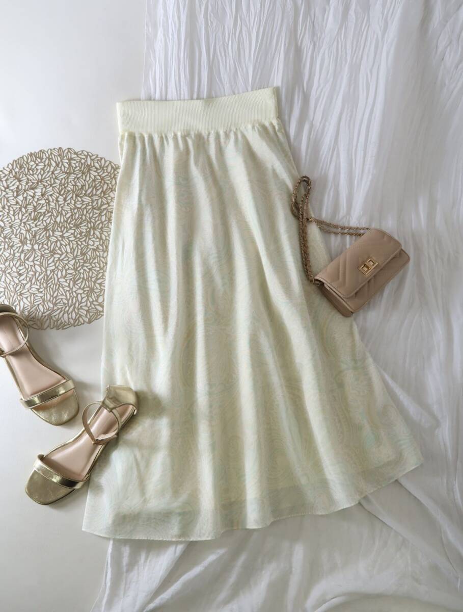スカートは裾に向かって緩やかに広がるシルエットでフェミニンな印象の一着。