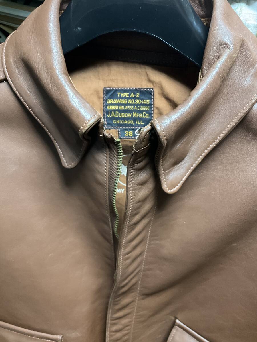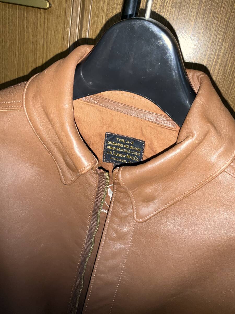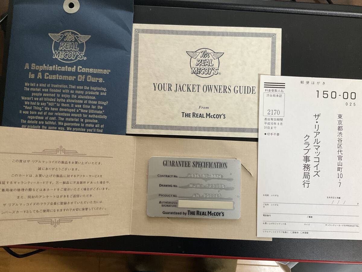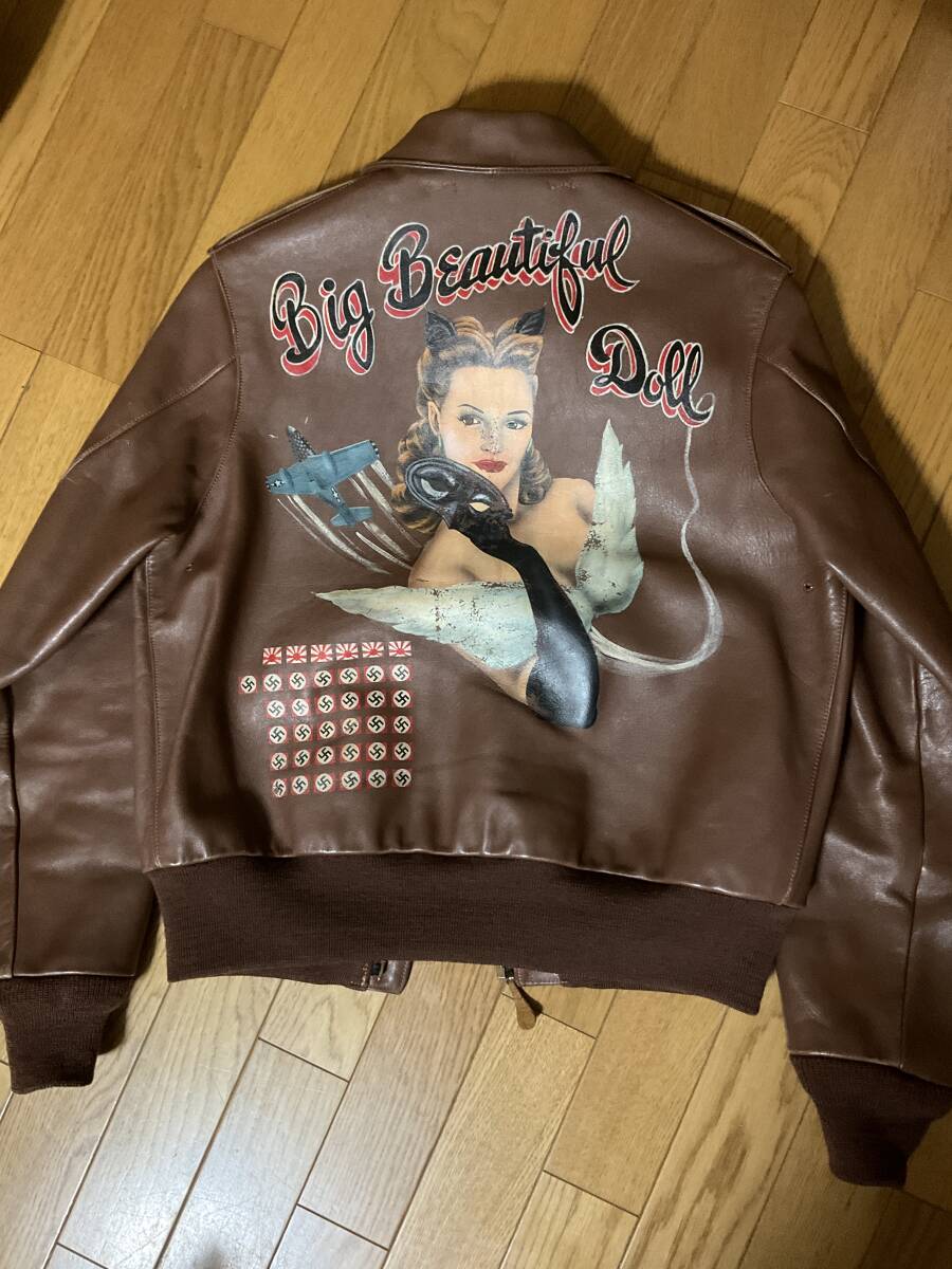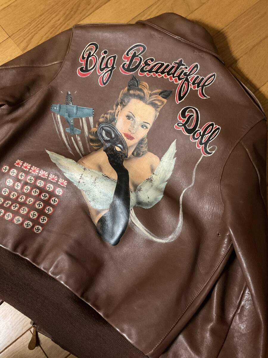 旧リアルマッコイズのA-2 BIG Beautiful Dollのバックペイント版です。Drawing No.-MJW-623006。J.A.Dubow。サイズは38で、172cm、72kgのややがっしり体型の私でジャストな感じです。おそらく175cmまでの方ならジャストサイズではないかと思います。葉書の差し出し期限が平成10年(1998)なので、90年代後半のものと思われます。年代を考慮すると、内外ともにとにかく状態が良く目立つ傷や汚れもありません。華やかなバックペイントは綺麗な状態です。革の状態も良好で艶があって上質です。若干の擦れ程度しかない感じで、革もまだ硬めであまり着られていない感じです。これから自分の体型に馴染ませていく楽しみがあると思います。マスタングペーストで少し保湿してありますので、さらに艶やかな革の質感です。若干の小傷程度はあるかもしれませんが、目につくリブの虫食い穴も見られません。良好な状態です。当時の付属品が揃っているのも貴重です。特にギャランティカードは厚みのある金属製で、高級感があるものです。この年代で、ここまで状態の良いA-2はなかなかないと思います。しかも極上のバックペイント付きです。カッコ良く着こなして目立つこと間違いないです。