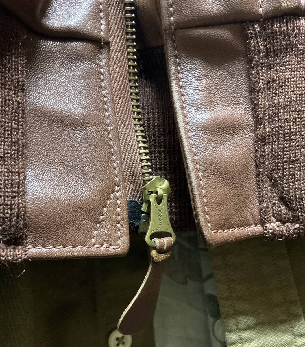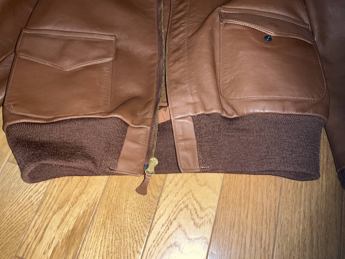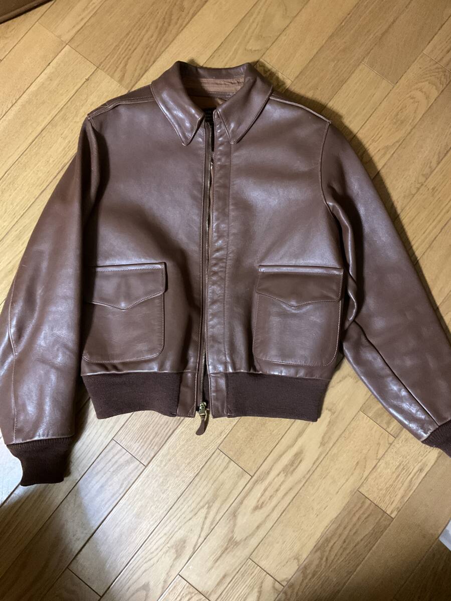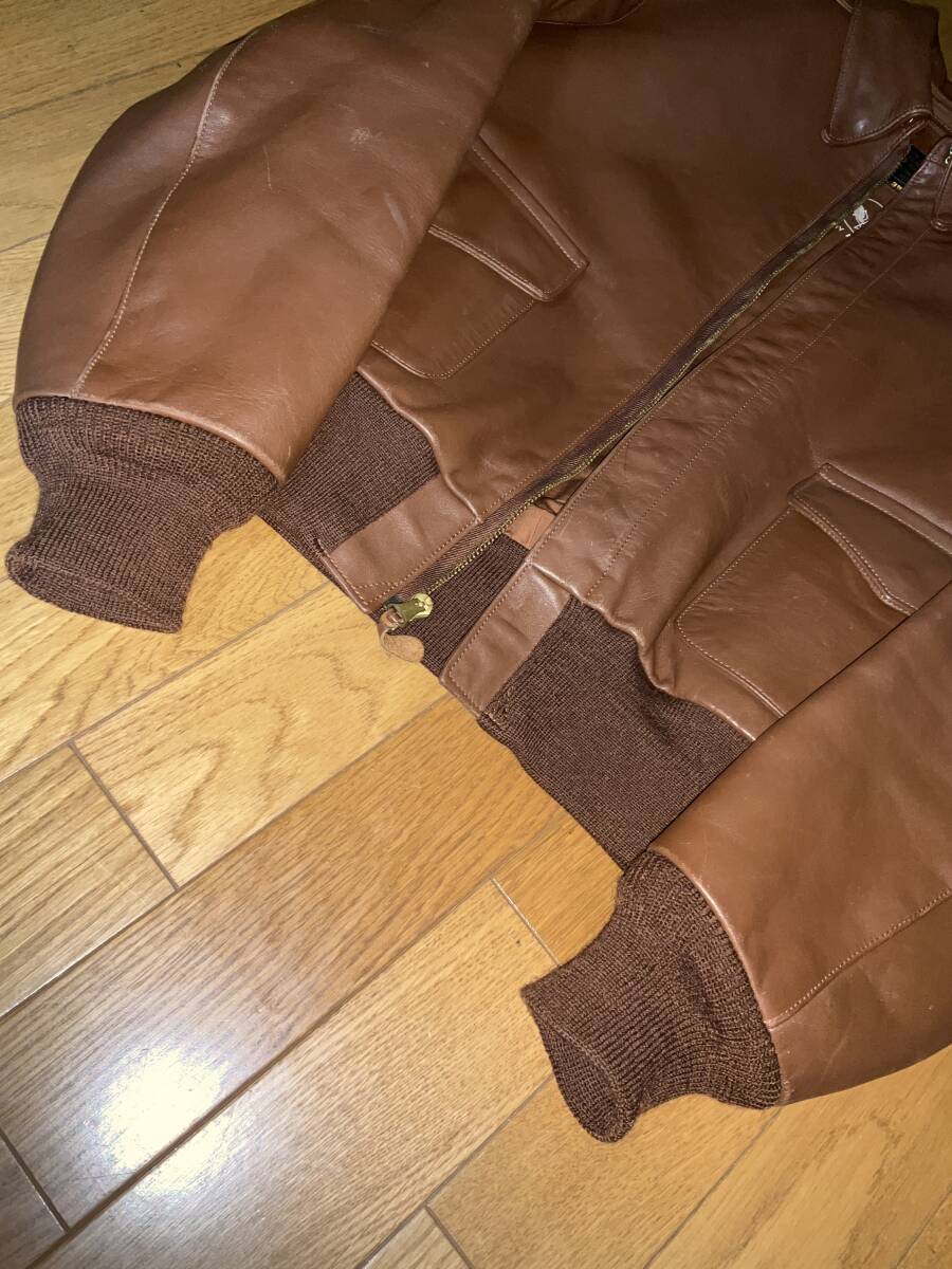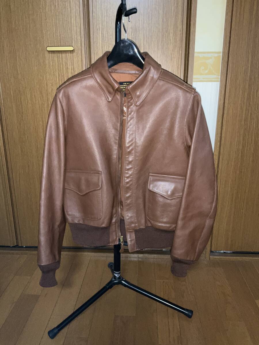 旧リアルマッコイズのA-2 BIG Beautiful Dollのバックペイント版です。Drawing No.-MJW-623006。J.A.Dubow。サイズは38で、172cm、72kgのややがっしり体型の私でジャストな感じです。おそらく175cmまでの方ならジャストサイズではないかと思います。葉書の差し出し期限が平成10年(1998)なので、90年代後半のものと思われます。年代を考慮すると、内外ともにとにかく状態が良く目立つ傷や汚れもありません。華やかなバックペイントは綺麗な状態です。革の状態も良好で艶があって上質です。若干の擦れ程度しかない感じで、革もまだ硬めであまり着られていない感じです。これから自分の体型に馴染ませていく楽しみがあると思います。マスタングペーストで少し保湿してありますので、さらに艶やかな革の質感です。若干の小傷程度はあるかもしれませんが、目につくリブの虫食い穴も見られません。良好な状態です。当時の付属品が揃っているのも貴重です。特にギャランティカードは厚みのある金属製で、高級感があるものです。この年代で、ここまで状態の良いA-2はなかなかないと思います。しかも極上のバックペイント付きです。カッコ良く着こなして目立つこと間違いないです。