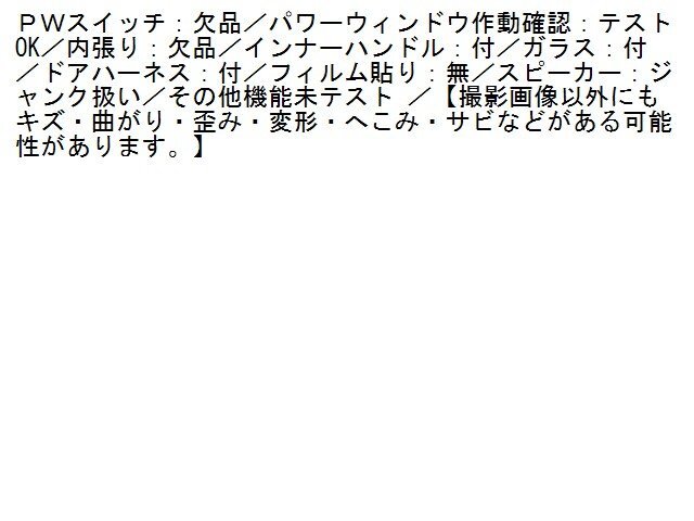 | 商品情報 | PWスイッチ:欠品/パワーウィンドウ作動確認:テストOK/内張り:欠品/インナーハンドル:付/ガラス:付/ドアハーネス:付/フィルム貼り:無/スピーカー:ジャンク扱い/その他機能未テスト /【撮影画像以外にもキズ・曲がり・歪み・変形・へこみ・サビなどがある可能性があります。】 | ||