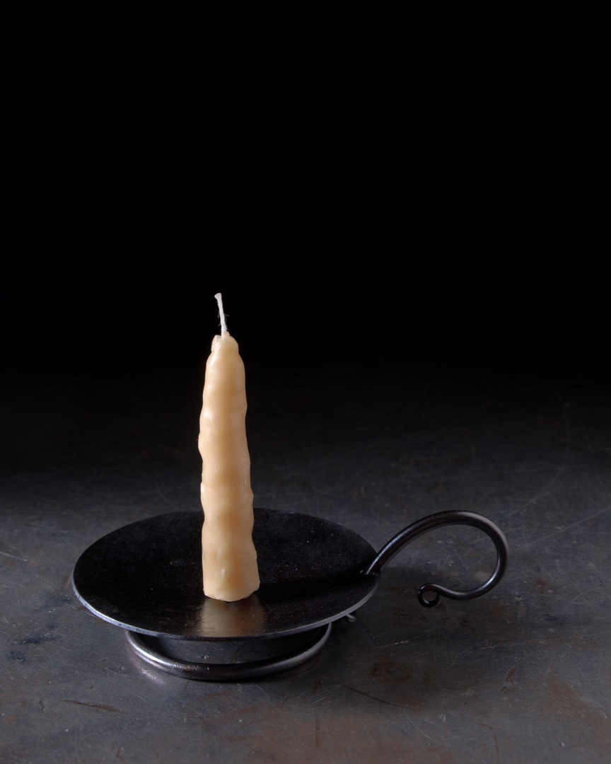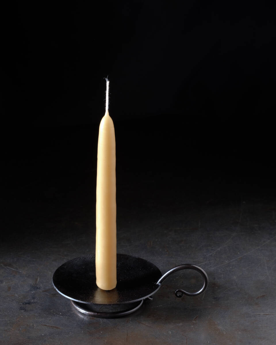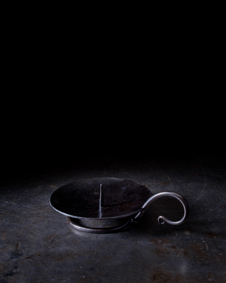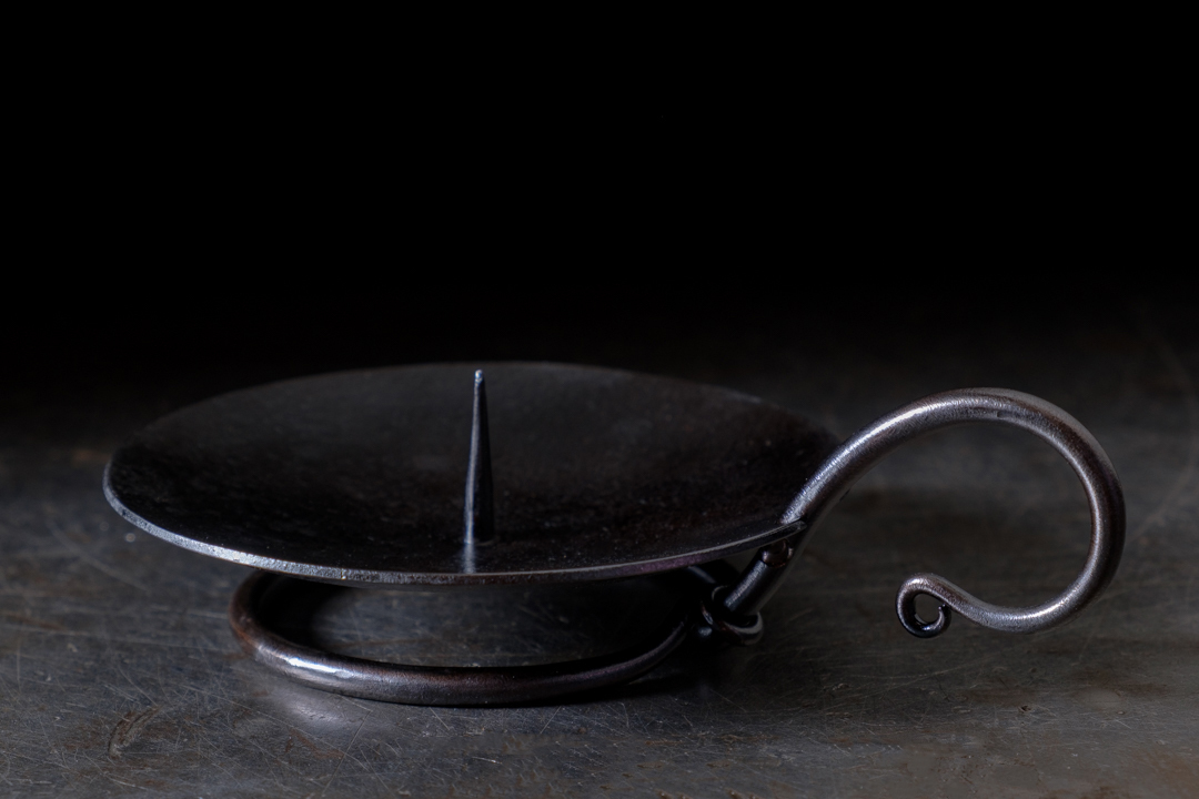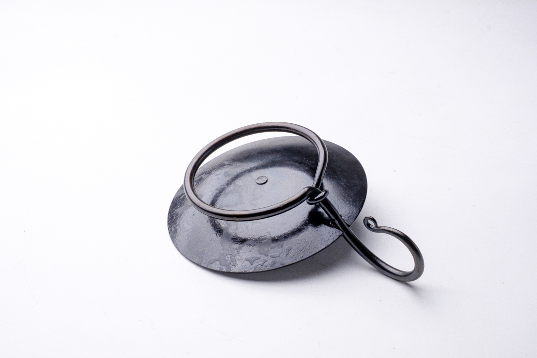 埼玉県三郷市の鍛冶工房にて1点1点手作りで制作されているキャンドルスタンドです。 新品未使用品です。 和風洋風どちらのインテリアでも使える、シンプルで飽きのこないデザインのキャンドルスタンドです。 一本の鉄を一筆書きのように曲線加工することで持ち手と脚部が作られています。 キャンドルだけではなく、お香やアクセサリー等の装飾台としてもご利用いただけます。 蝋受け皿にロウソクを立てる為のニードルがあります。 ニードルに差すことで細身のキャンドルにもご利用いただけます。 蝋受け皿と底面の間に約1cmの隙間があります。 この隙間があることで、ロウソクの熱によってテーブルや家具天面などがダメージを受けにくい構造となっています。 仕上げには蜜蝋と自然由来オイルをオリジナルブレンドした油脂で油焼きを施してあります。 表面はサラサラに乾燥して黒艶が出ている状態です。 手間も時間もかかる仕上げ技法ですが、炎の中で鍛造することで現れた鉄の表情がより際立つ仕上げです。内容 キャンドルスタンド 1個 撮影に使用したキャンドル等の小物類は付属いたしません。 手作業で制作している為、形状に若干の差が出てしまう場合がございます。)配送方法 発送はクロネコヤマト宅急便コンパクトで行います。 梱包は宅急便コンパクト専用ボックスとクイックフィットエコノを使用しています。寸法と重量(平均値) 材質:鉄 持ち手を含む長さ:約14cm 蝋受け皿直径:約9.8cm 持ち手高さ:約4cm 蝋受け皿高さ:約2.0cm 重量:約140g使用上の注意 蝋受け皿の容量を超える大きなロウソクを使用しないでください。転倒や溶けた蝋が溢れる恐れがあります。 火を灯したロウソクのそばから離れないでください。 エアコンや扇風機などの風がある場所では使用しないでください。 可燃性のもの、熱に弱いもののそばでは使用しないでください。 小さなお子様の手の届かないところでご使用ください。 湿気の多い場所での使用や、水分が付着したままですと鉄製品なのでサビが発生する場合がございます。 ご使用後に残った蝋を大まかに取り除いていただき、残ったごく小さな粒状の蝋の欠片を 乾いた布などで擦り付けていただくと、蝋の油分(蜜蝋、ソイオイル、パラフィン)が鉄の表面を コーティングする効果があります。既に油焼き仕上(シーズニング)によって錆びにくい状態になっていますが、このメンテナンスをしていただく事によってさらにサビにくくなります。 >