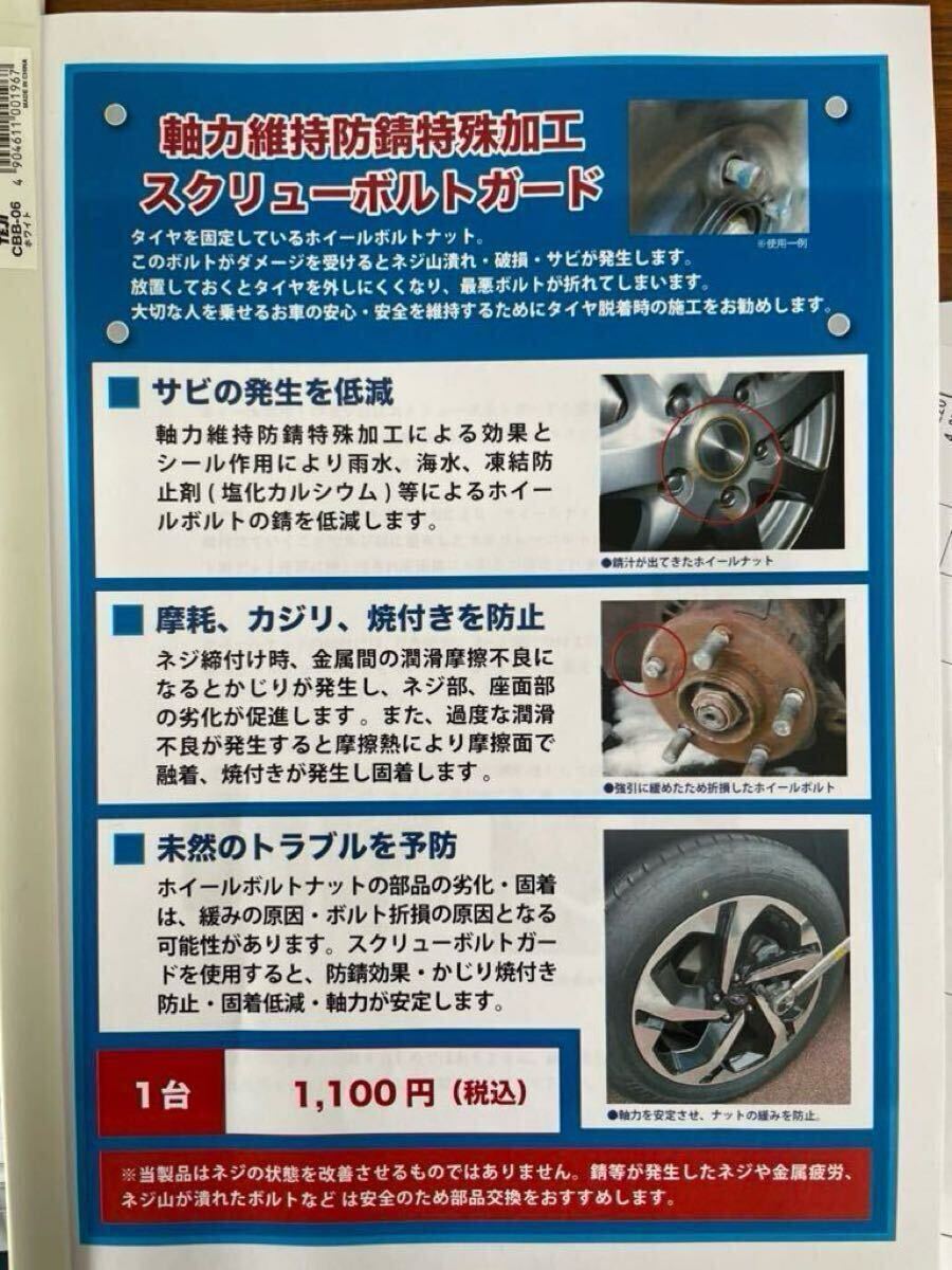 実際はディーラーに行っても、リフトで上げる、20個のナットの脱着、スクリューボルトガードの塗布といった一連の作業を伴うメニューを単体で1000円ではやってくれません。