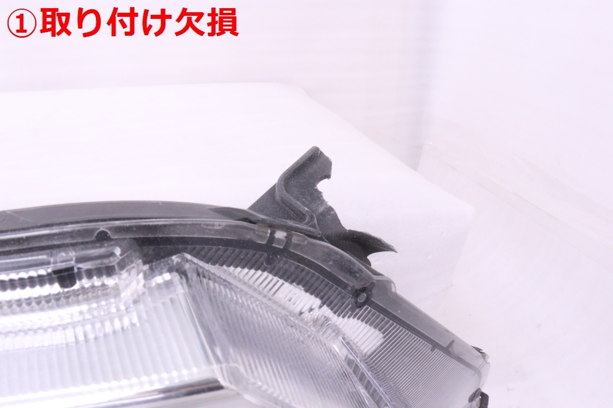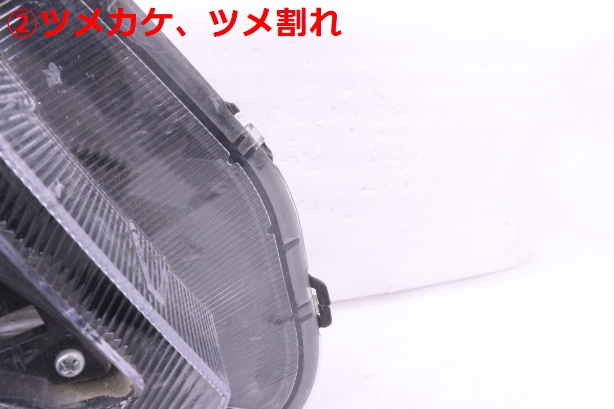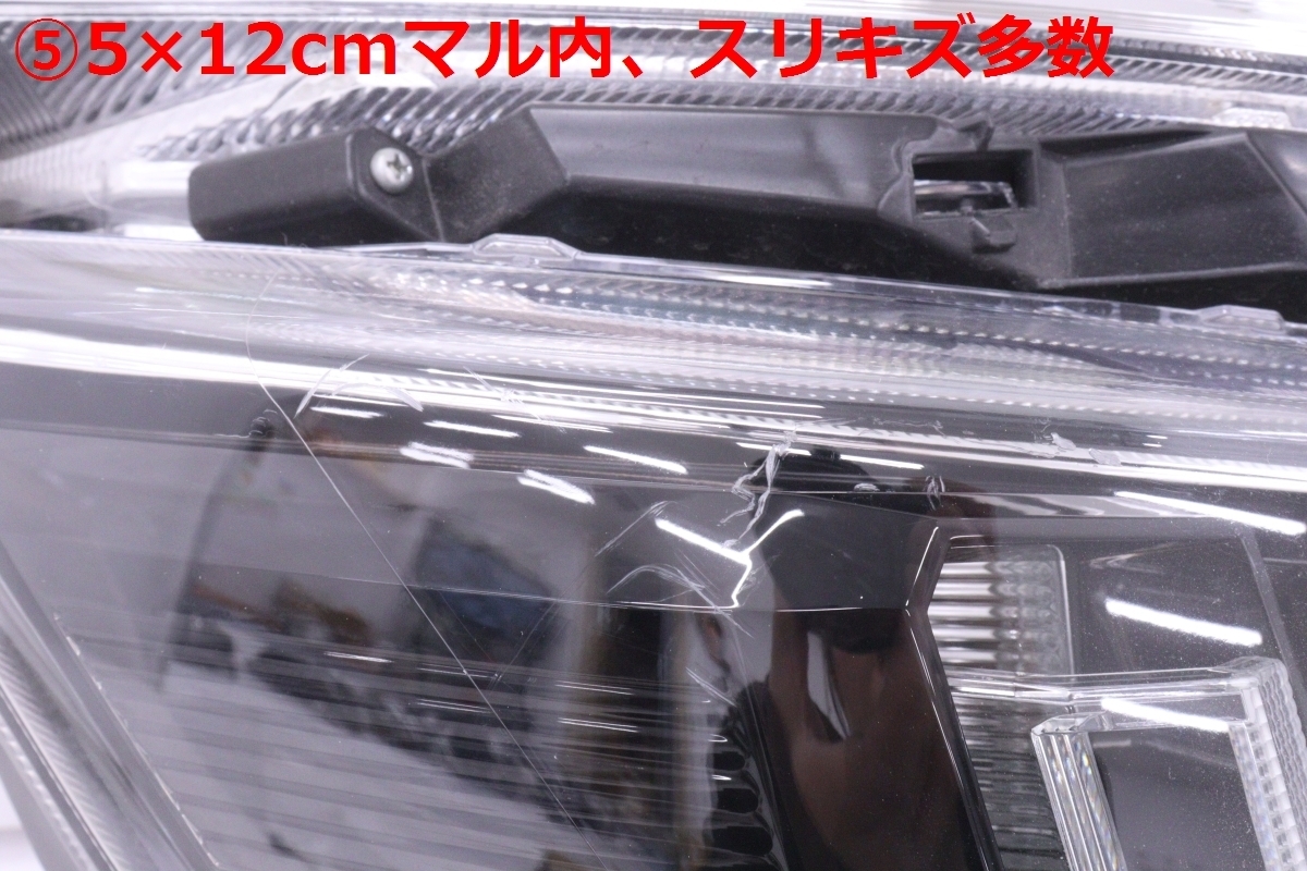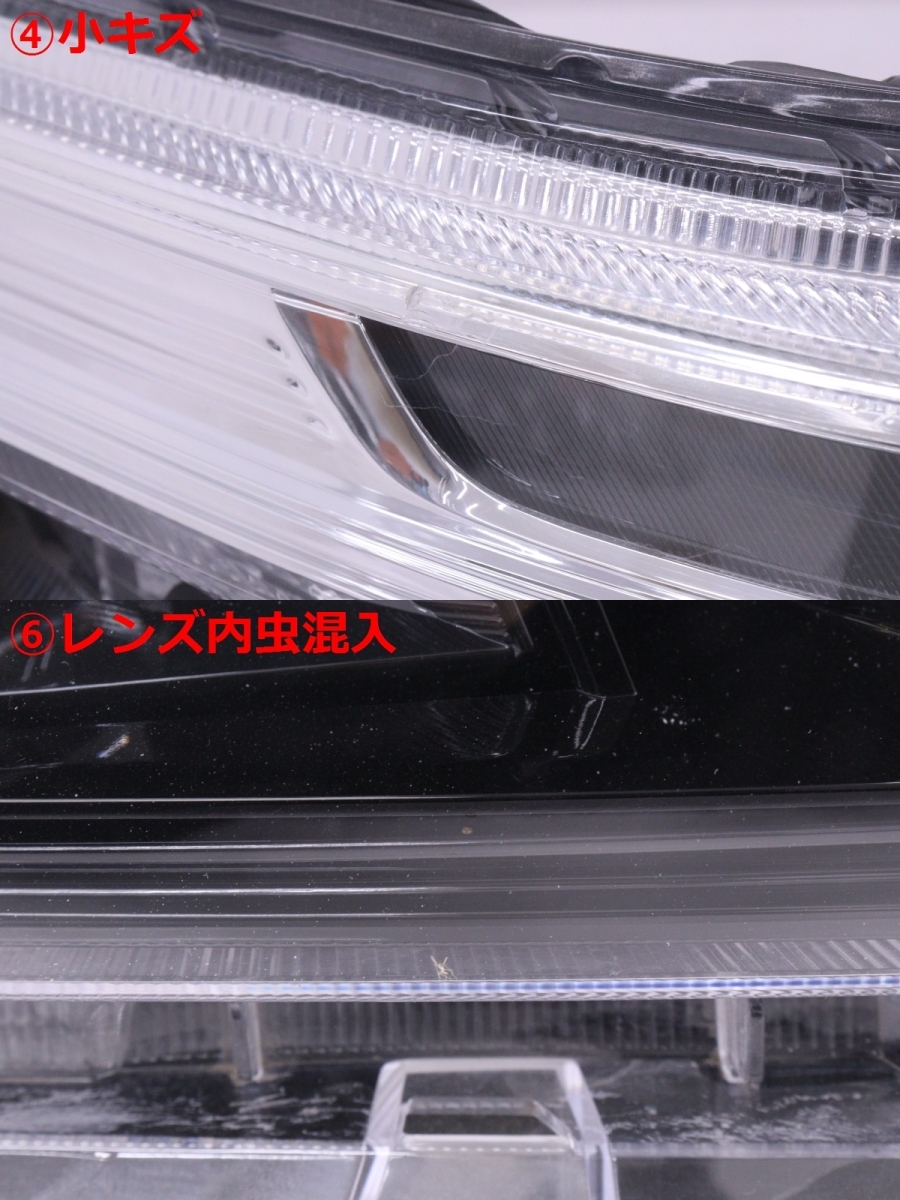 全体洗車キズ、細かい飛び石キズ、レンズ上側クリア剥がれ、レンズ内ホコリ混入多数