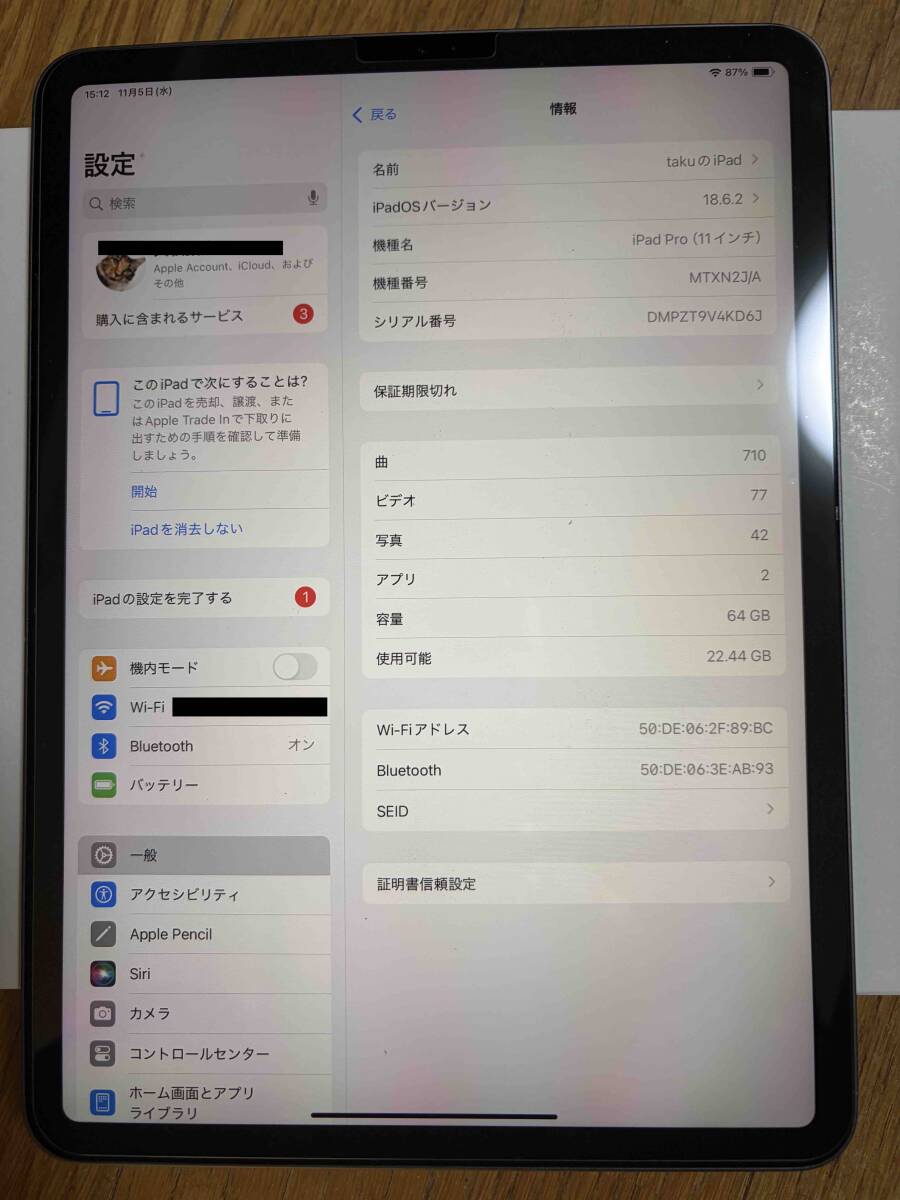 IPadPro 11インチ1世代wifi 64GB 中古ジャンク故障品、問題商品、可能無法修理,請注意 扱い 出品にあたり確認しましたら、左上にドット抜けと思われるわずかな点あります。 また今まで使用中には全く気づかなかったのですが、 今回写真撮って確認してみると中央右下にモヤっとした箇所ありました。 まだあるかもしれませんが画像で判断ください。 今までネット閲覧、YouTubeで動画みたり,音楽再生等を中心に使っていました。 他使用中に動作に問題はありませんでしたが、多機能で全ての機能を確認できていないのでジャンク故障品、問題商品、可能無法修理,請注意 扱いでお願いします。 フロントパネルは保護フィルム貼っていましたので綺麗だと思います。 ケースに入れて使っていましたので外観も綺麗な方だと思います。写真で判断ください。 完全禁煙環境での使用でしたので嫌な匂いはないとお思います。バッテリ國際運送規定電池為危險物品,無法運送,購買後會幫您取出丟棄。 ーは劣化していると思いますが、特に問題なく使ってました。 この画像の後初期化してアクティベーションロック解除してあります。 保護フィルムはこのまま貼ったままで発送いたします。(2025年 11月 6日 19時 04分 追加) 発送方法ですが、ゆうパケットプラスとありますが、長さが足りないようなのでレターパックプラスで発送させていただきます。 >