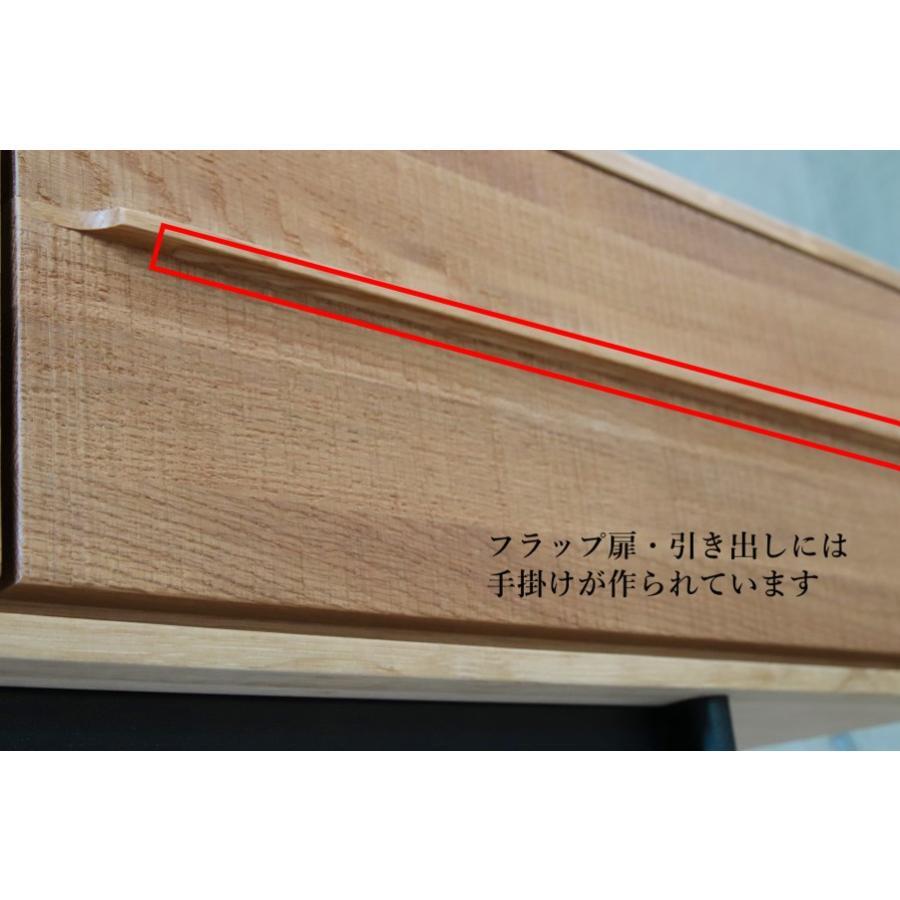 帯鋸目加工のデザインを優先し、AV収納部分も無垢材を使ったフラップ扉に仕上げているので、