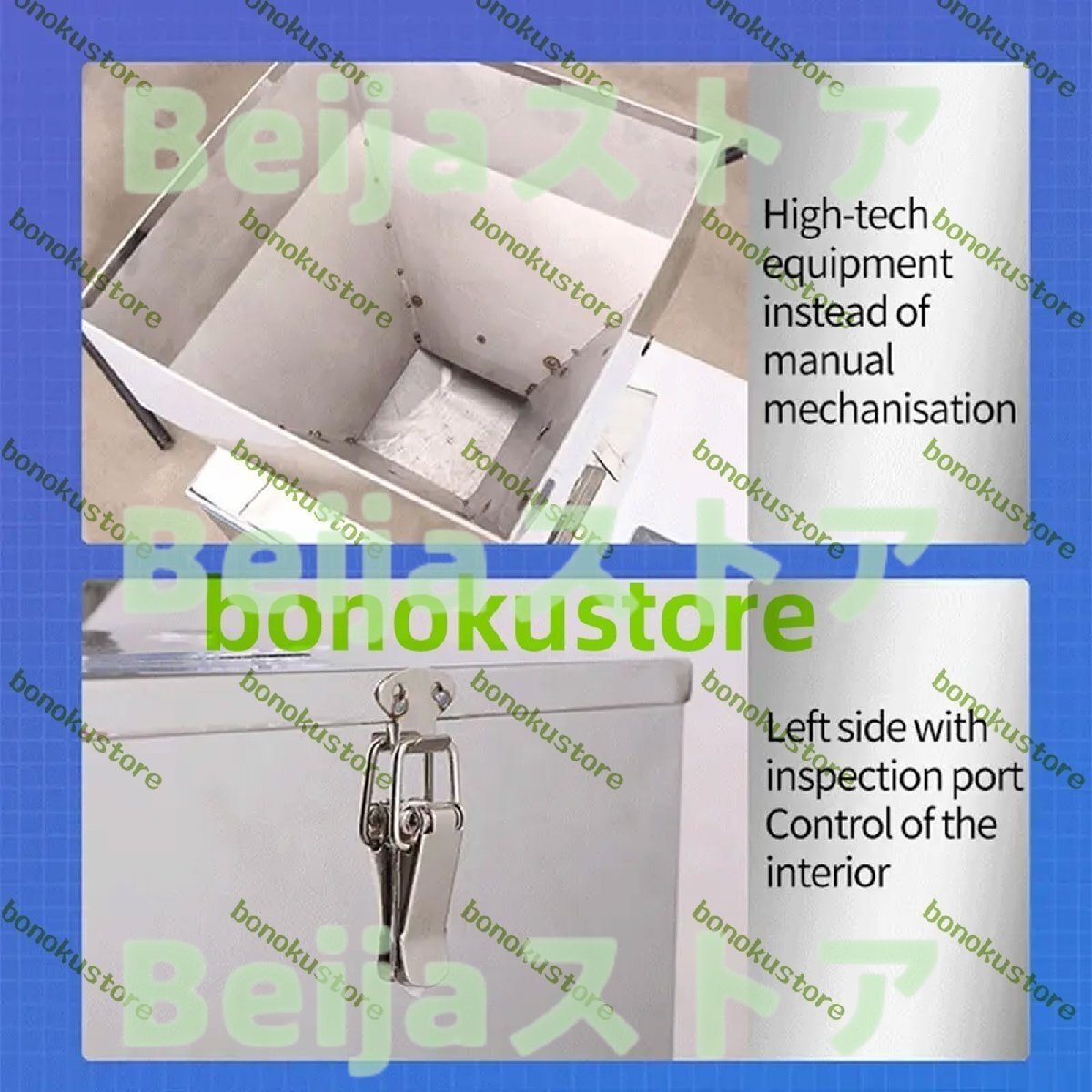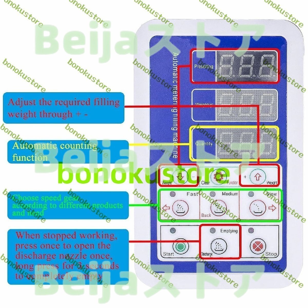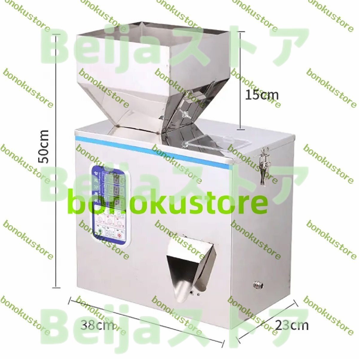 製品名: 粉末充填機 計量範囲: 2~120g 本体材質:食品グレードのステンレススチール 誤差範囲: 0.2g 電圧電力: 220V 電力: 180W 包装速度: 10~20回/分(材質により異なります) 商品サイズ: 38x23x50cm ホッパーサイズ: 20x15cm