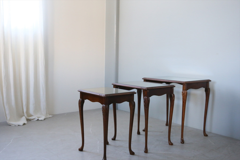 イギリスの田舎で見つけた猫脚のネストテーブル(3台セット)です。