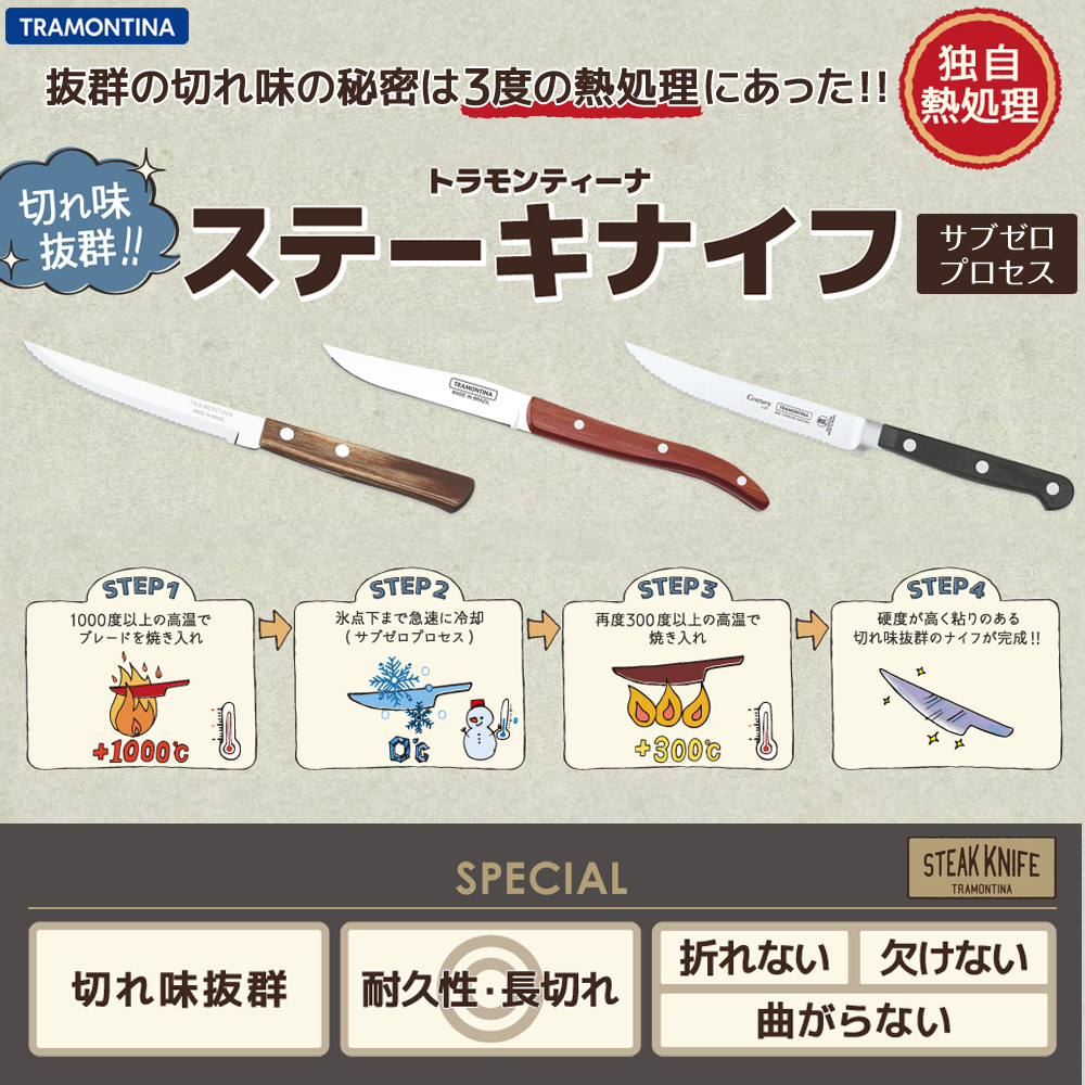 商品詳細 商品内容 ステーキナイフ 25cm(刃渡り4inch)×12本 メーカー TRAMONTINA (トラモンティーナ/ブラジル) サイズ 全長25cm 刃渡り4インチ(約10.5cm) 材 質 ステンレス、木(ポリエステル加工) 重 量 95g 備 考 ナイフの刃はよく切れますので扱いには十分にご注意ください