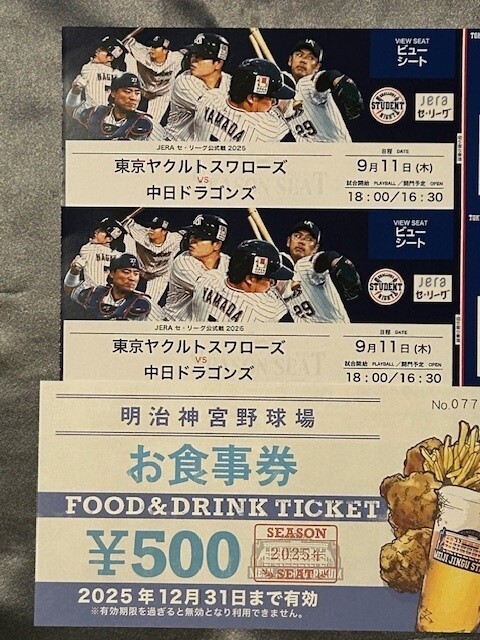 ◆【送料無料】9月11日(木) 東京ヤクルトスワローズ 対 中日ドラゴンズ 神宮球場 3塁側 ペア席連番2枚 お食事券付き 村上宗隆 長岡秀樹