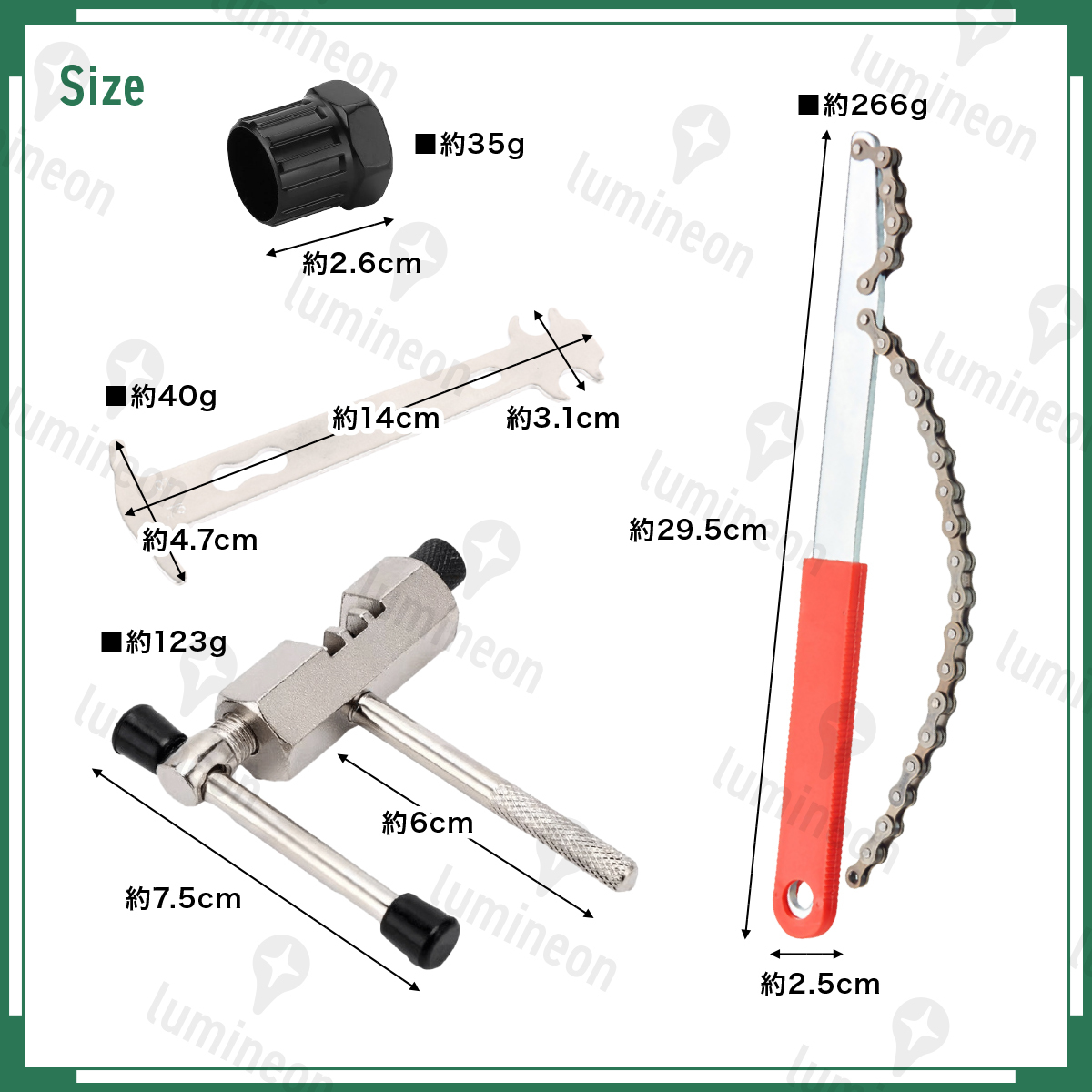 その他の自転車アクセサリーはこちら セット内容 ■チェーンカッター ■フリーホイールリムーバー ■スプロケットリムーバー ■チェーンチェッカーサイズ チェーンカッター:全長約9cm スプロケットリムーバー:全長約29.5cm フリーホイールリムーバー:全長約2.6cm チェーンチェッカー:全長約14cm重量(合計) 約464g