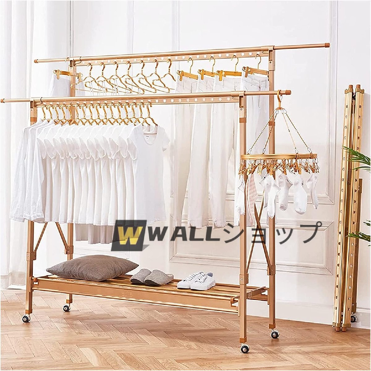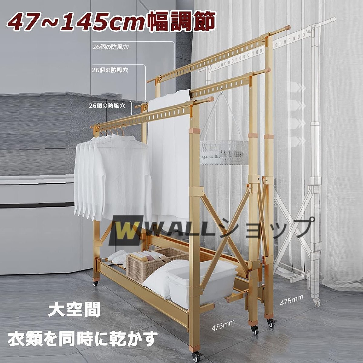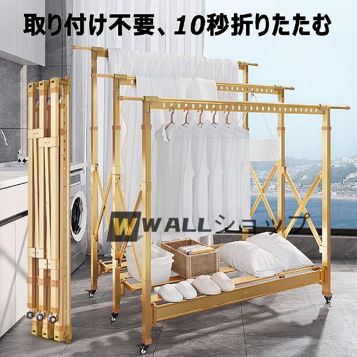 ●物干し台を広げて、好きなだけ入れて、減圧サポート足、ヒンジ補強、フレームを傷つけない、丈夫で安定。この格納式物干しラックは、屋内外、ホール、寝室、洗濯室、中庭、バルコニーなどで使用できます。スペースを節約し、3 秒で折りたたんで収納できるので、収納スペースが増えます。
