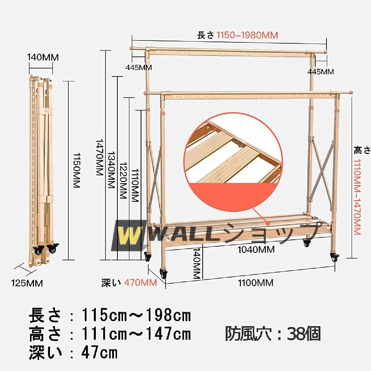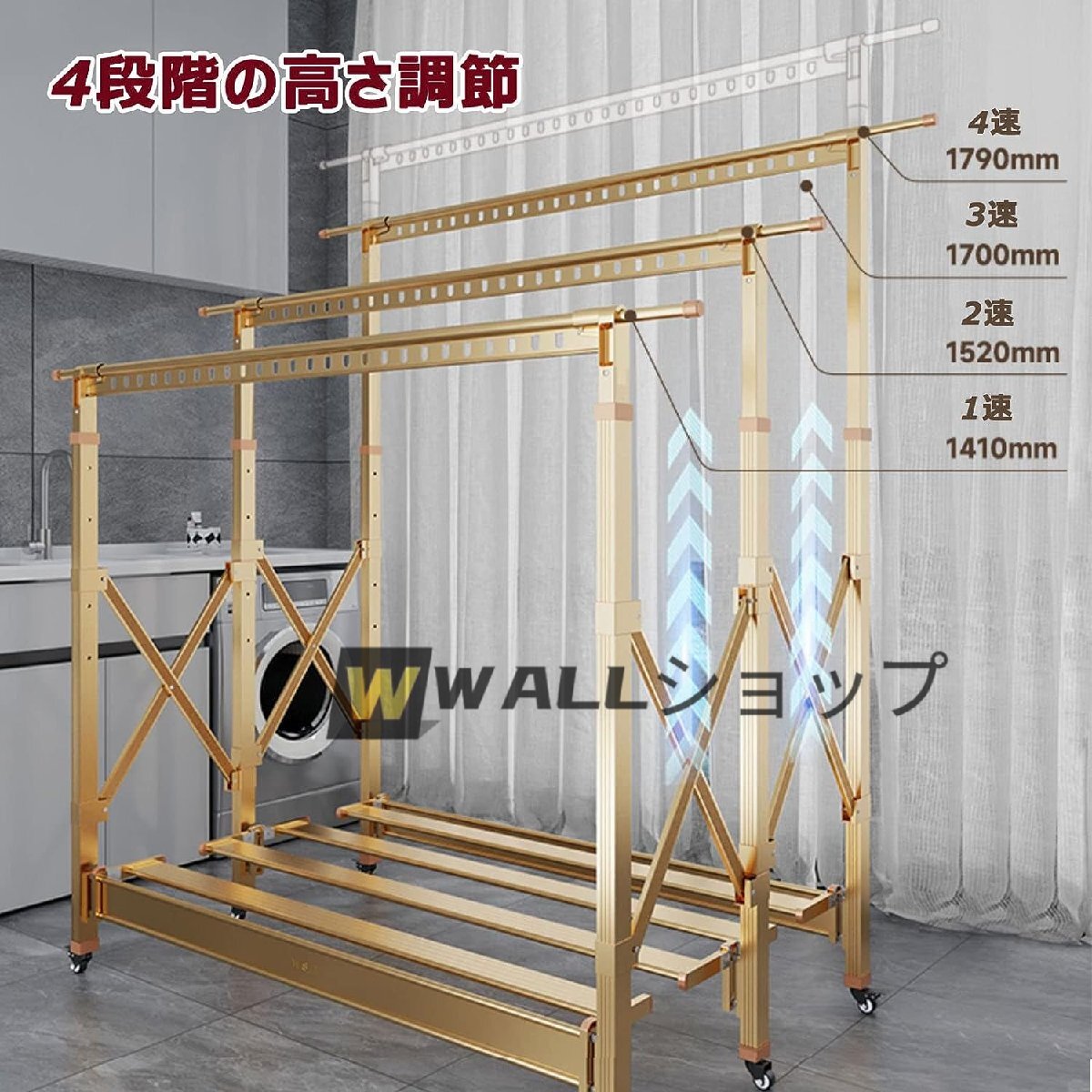 ● 物干し台 4段階の高さ調節可能、衣類乾燥機やサーキューレーターをお持ちの方におすすめ。竿の高さを変えれば送風も当たりやすく。