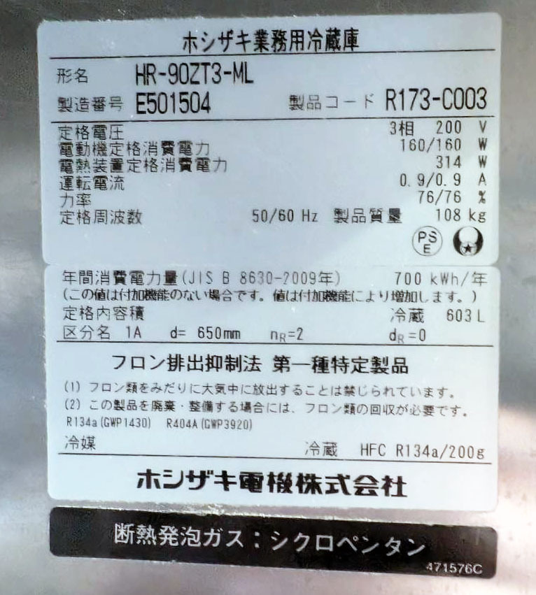 商品情報 メーカー ホシザキ 形名 HR-90ZT3-ML サイズ W900 x D650 x H1890(mm) 詳細 ○定格電圧 3相200V ○定格周波数 50/60Hz ○電動機定格消費電力 160/160W ○電熱装置定格消費電力 314W 〇運転電流 0.9/0.9A ○力率 76/76% ○定格内容積 603L ○冷媒 HFC R134a/200g ○製品質量 108kg 動作 動作確認済※必ず入札前に、上記詳細をご一読ください。