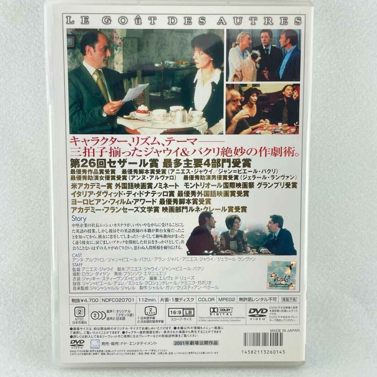 【概要】会社社長の中年男の純情な恋を描くユーモラスなラヴ・ストーリー。監督・脚本・出演は「恋するシャンソン」の脚本・出演などで知られるアニエス・ジャウイで、監督はこれが初めて。脚本・主演は同じく「恋するシャンソン」の脚本・出演を担当したジャウイのパートナーで、「パリの確率」などの俳優としても知られるジャン=ピエール・バクリ。撮影は「ヴァンドーム広場」のロラン・ダイヤン。共演は「ダントン」のアンヌ・アルヴァロ、「ディディエ」のアラン・シャバ、「ジャンヌと素敵な男の子」のクリスティアーヌ・ミレ、「アンナ・オズ」のジェラール・ランヴァン、「家族の気分」のウラディミール・ヨルダノフほか。2000年モントリオール国際請注意日本當地運費,確認後再進行下標。 映画祭グランプリ、同年ヨーロピアン・フィルム・アワード脚本賞、2001年セザール賞作品賞、脚本賞、助演女優賞、助演男優賞受賞。 ※視聴回数1度のみで、ジャケットケース、盤面共に良好な状態ですが、あくまで中古品としてご認識下さいませ。また、及び外装コンディションに完璧を拘れる方は、専門店でのご購入をお勧めさせて頂きます。よろしくご理解の程、お願いいたします。 ◆再生確認済みです ◆ジャケットケース:大変綺麗です ◆盤面:大変綺麗です(中古DVDの上〜最上ランク) ※ 経年劣化による外観の軽微なダメージや、再生による軽微なスレなどはご容赦ください ※未使用、新品ではございません ※大変綺麗な状態ですが、外装や盤面など完璧を求められる方のご入札はお控え下さい ※ 全ての商品は発送前に軽くクリーニング、再生確認済みとなります ※1枚1枚確認しておりますので、経年劣化によるダメージがある場合は、出来る限り文面にてお伝え致しております ◆全ての商品は発送前に、商品の目視チェック、しっかりと再生確認しておりますが、万が一、再生出来ない等ありましたら、お手数ではございますが、ご連絡下さいませ。誠意のあるご対応をさせて頂きます。但し、商品のすり替えや、視聴後に、故意に傷付ける、試聴不可能にする、状態がイメージと違ったなどの反応に関しては、応対しかねますのでご容赦下さいませ ◆お手軽配送ゆうパケットにて発送させて頂きます(内側プチプチ封筒にて梱包いたします) ◆複数枚ご購入の方には、同梱にて配送致します。また、料金が変更になる場合については都度、お伝えさせて頂きます。他社の配送便に関しては、業務煩多、トラブル回避のため申し訳ございませんがお断りさせて頂きます。取り引き開始後、ご連絡頂いてからの送料ご通知となりますのでご理解お願い致します ◆落札商品の発送日に関しまして、柔軟に対応させて頂きますが基本的に月曜から金曜日間での対応とさせて頂きます。原則、土日祝の発送はしておりません ■インボイス制度には対応しておりません ■ご質問は入札前にお願いします。出来る限りの対応はさせて頂きますお互い無用のトラブルを避けるため、新規の方、評価が不良の方、キャンセルの多い方その他…入札は取り消しさせていただくことがあります ■ご落札者様のご事情(追加で購入したい、同梱希望等)対応次第にて一時的な取り置きをさせて頂く予定ですので、お気軽にご相談下さい ■荷物到着時における受け取り完了は必ずお願い致します ■その他、柔軟な対応に心がけますのでご教示頂けます様どうぞ宜しくお願い致します >