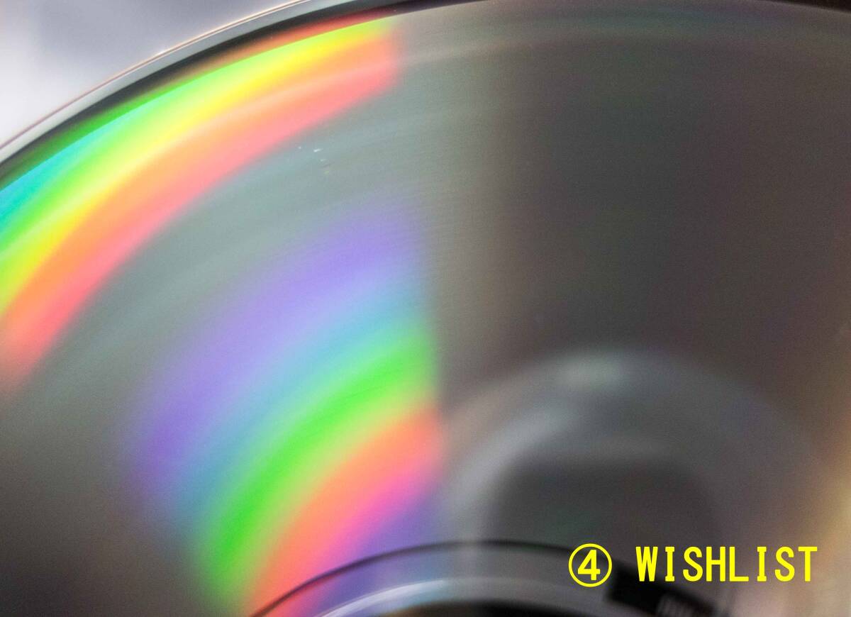 ジャケット:3面折り込みタイプのデジパックスリーブです。スリーブ各面にはスレ、点状や線状の薄いキズが多数あります。ディスクトレーに接触する面には、トレーの押し跡も見られます。英語のブックレットと日本語解説のインサートが付いています。日本語解説のインサートに、波打ちのような緩いシワがいくらかあります。スリーブ裏面左上に見本盤シールが貼り付けられています。 ディスク:目立つ長い直線状のキズが1か所、内周部に断続的に続く目立つキズがあります。音声データ記録範囲外の外周エッジ付近にも目立つキズが数か所あります。それ以外にも全体的に薄いキズがいくらかあります。当方の再生環境では音飛びやノイズは確認できませんでした。見本盤です。 帯:線状、点状のキズが数か所あります。 ④ WISHLIST (maxi-single・promo) [SONY RECORDS SRCS 8631](ジャケVG/ディスクEX/帯VG)