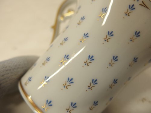ドイツの名窯 KAISER(カイザー) の「Linderhof(リンダーホフ)」シリーズ、デミタスカップ&ソーサー2客です。 上品な白磁に花紋と金彩が施された華やかなデザインで、クラシカルなヨーロピアンテイストを感じさせます。 コーヒーやエスプレッソ用としてはもちろん、インテリアとしてもおすすめの一品です。 【サイズ】 カップ:口径φ6.4×フチ高さ6.2cm程度 ソーサー:φ11.1×高さ1.9cm程度 【商品状態】 ・中古品 ・金彩に変色やスレ、くすみがあります。 ・汚れやスレ、小キズが見られます。 ※中古品のため状態にご理解のうえご検討ください。