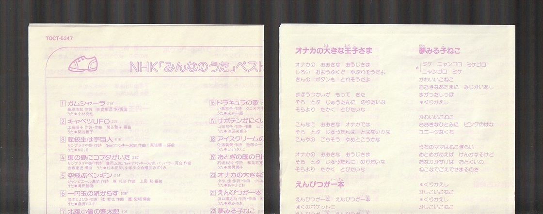 | 商品名稱 : | NHK みんなのうた ベスト TOCT-6347 ガムシャーラ 全30曲 廃盤CD 帯付き 小林克也 関谷雅子 酒井司優子 れいち 永井一郎 岩男潤子 水森亜土 |
