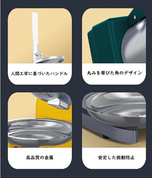 この氷の粉砕機は肘に適切なサイズのアイスキューブを置く(アイスキューブはオーバークラッシュしてはいけません。一枚の氷の大きさは肘に収まって、肘から20mm以下にぶら下げてください)。電気氷粉砕機は、アルミニウム合金を主材料として用いており、表面は特殊な工程で処理されます。カッターは高品質のステンレス鋼製で、着用が容易ではありません。この機械はまた、簡単な操作、安全性、耐久性のために氷を粉砕する美しい外観と高効率の利点を持っています。