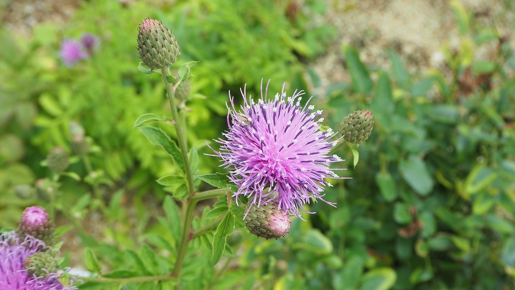 じ仲間ではありません。タムラソウは全体の姿がアザミの仲間によく似ていますが、葉にも茎にも