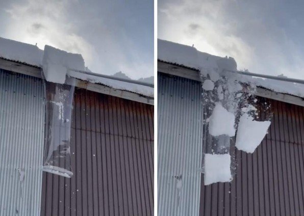 屋根の上からも下からも雪がドンドン滑り落ちます。