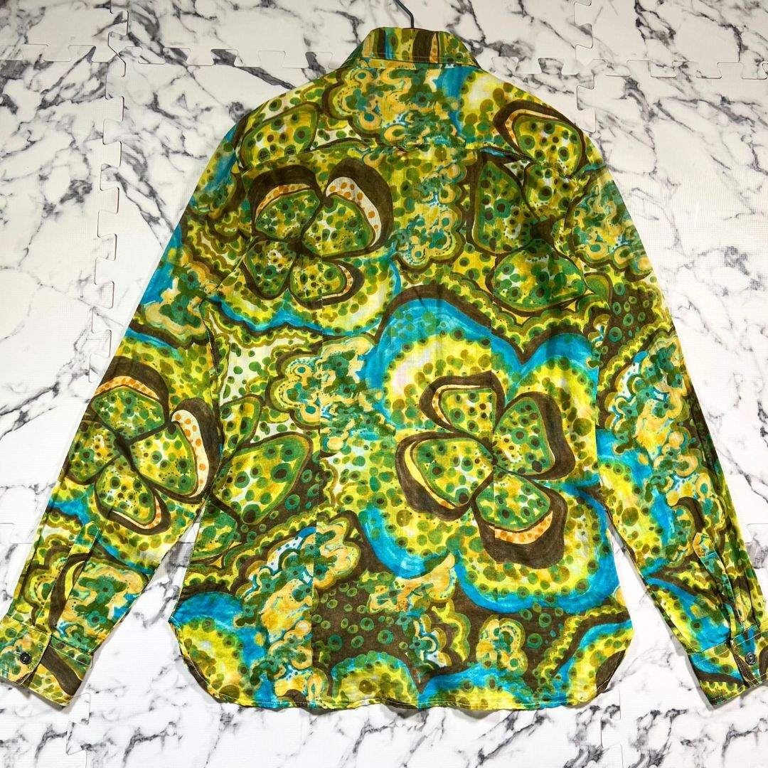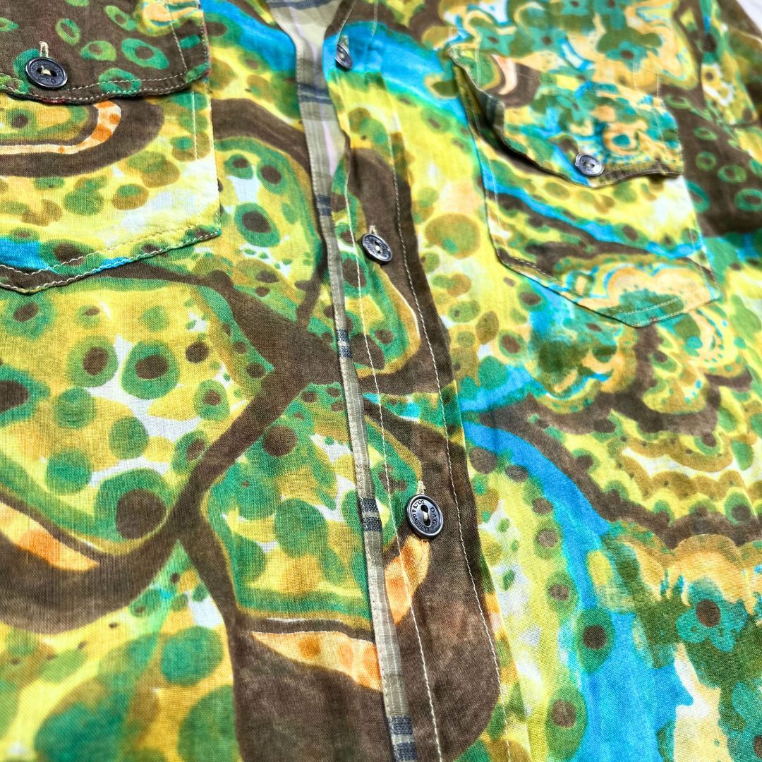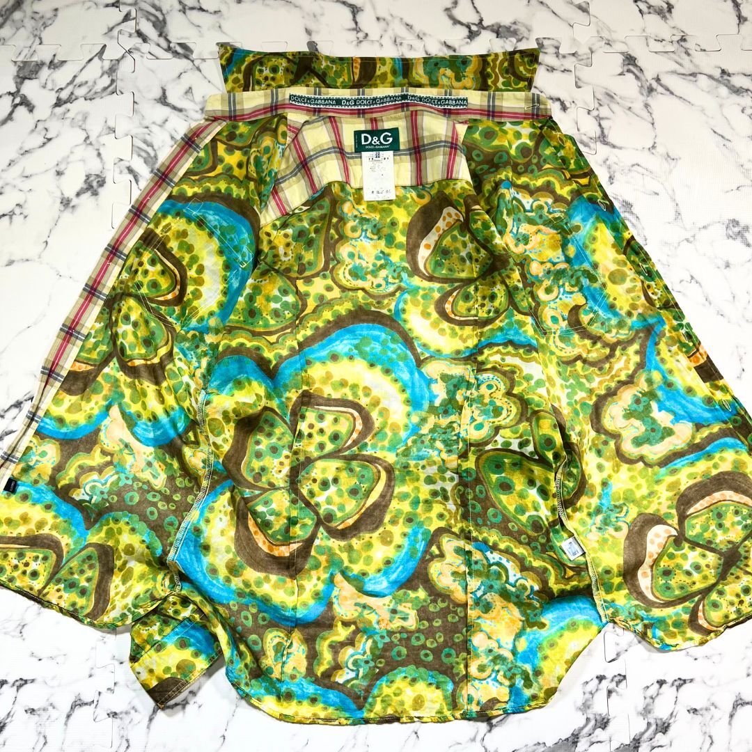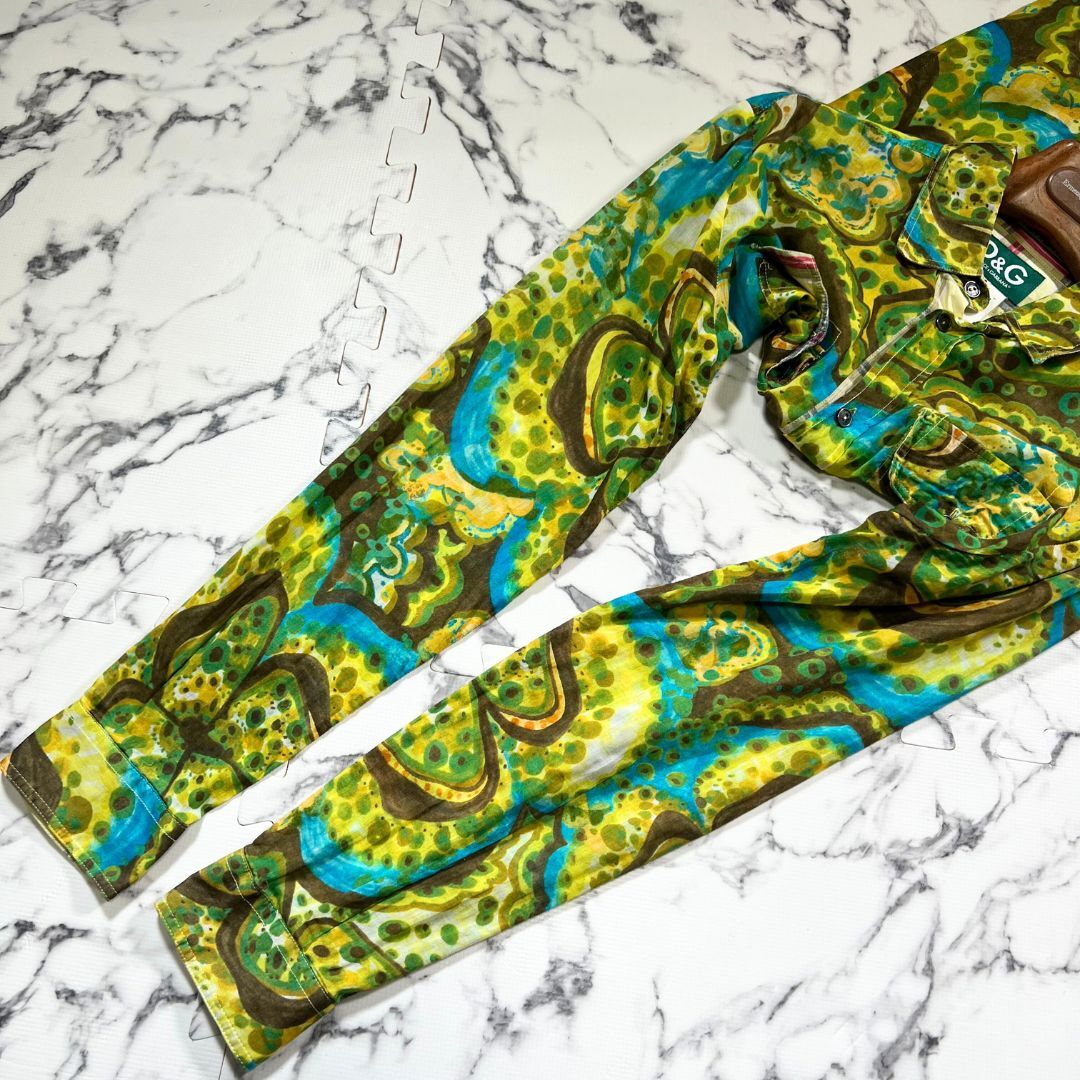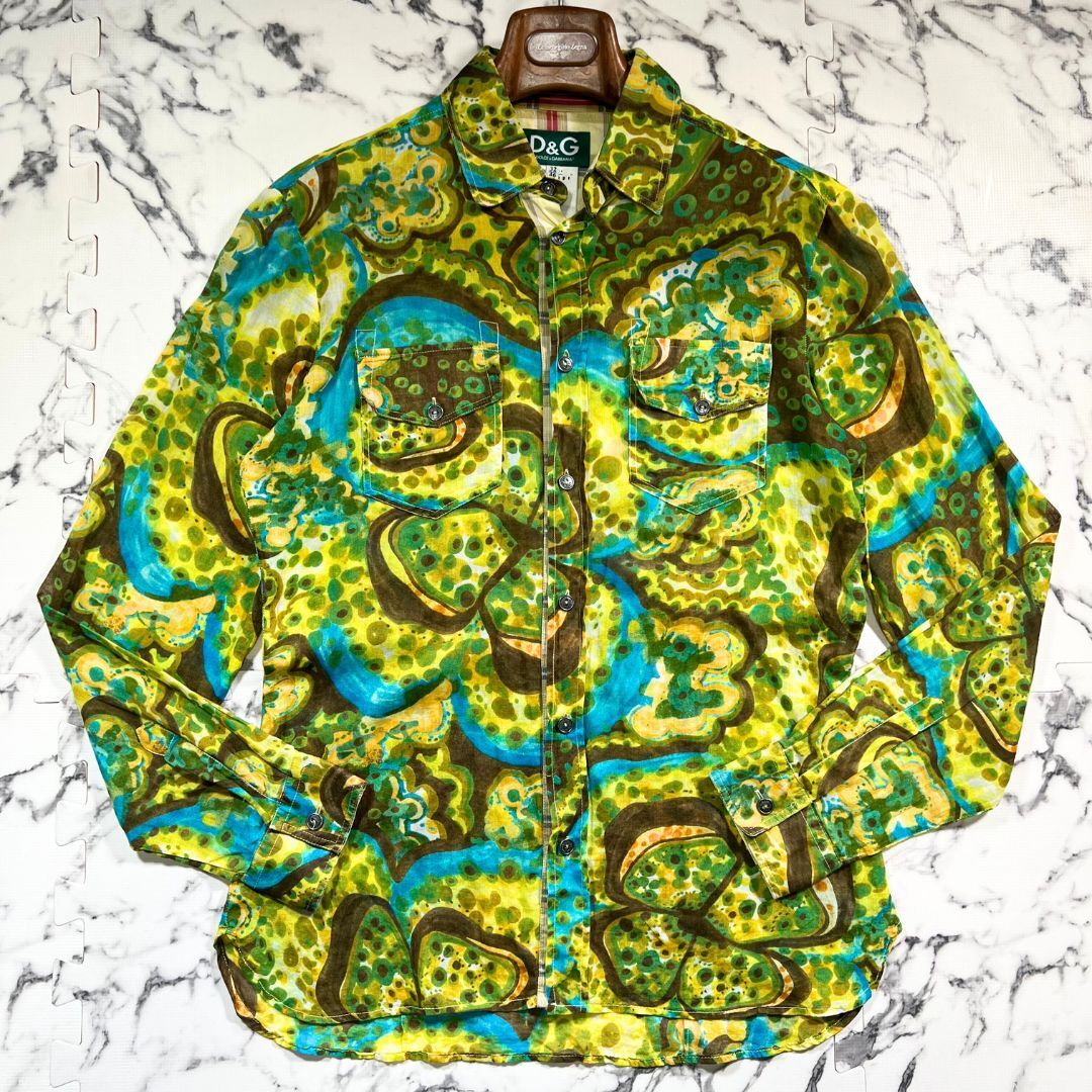 DOLCE&GABBANA(ドルチェ&ガッバーナ)より、四つ葉の花柄が印象的な長袖シャツ(サイズ46/XL相当)のご紹介です。イタリア製ならではの上質な仕立てと、ブランド特有の華やかなデザイン性が融合した一着。グリーン×イエローの色使いが鮮やかで、落ち着いた中にも遊び心を感じさせる総柄デザインが特徴です。小ぶりな四つ葉モチーフが全面に配されており、品のある可憐さを演出。さらに前立て裏やカフス裏にはクラシカルなチェック柄を切り替えとして使用し、袖口をロールアップした際にも洒落感が漂います。生地は薄手のコットン素材で、春夏にぴったりな軽やかな着心地。さらっと羽織るだけでコーディネートに個性を与えてくれます。シルエットは程よくゆとりがありつつもスマートな印象で、デニムやスラックスとも好相性。状態は美品で、目立つ汚れやダメージのない良好なコンディションです。D&Gらしい色気と上品さ、そしてイタリアンカジュアルの洗練を兼ね備えた一着。この機会にぜひご検討ください。