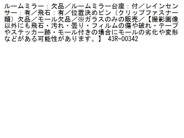 | 商品情報 | ルームミラー:欠品/ルームミラー台座:付/レインセンサー:有/飛石:有/位置決めピン(クリップファスナー類)欠品/モール欠品/※ガラスのみの販売/【撮影画像以外にも飛石・汚れ・曇り・フィルムの傷や破れ・テープやステッカー跡・モール付きの場合にモールの劣化や変形などがある可能性があります。】 43R-00342 | ||