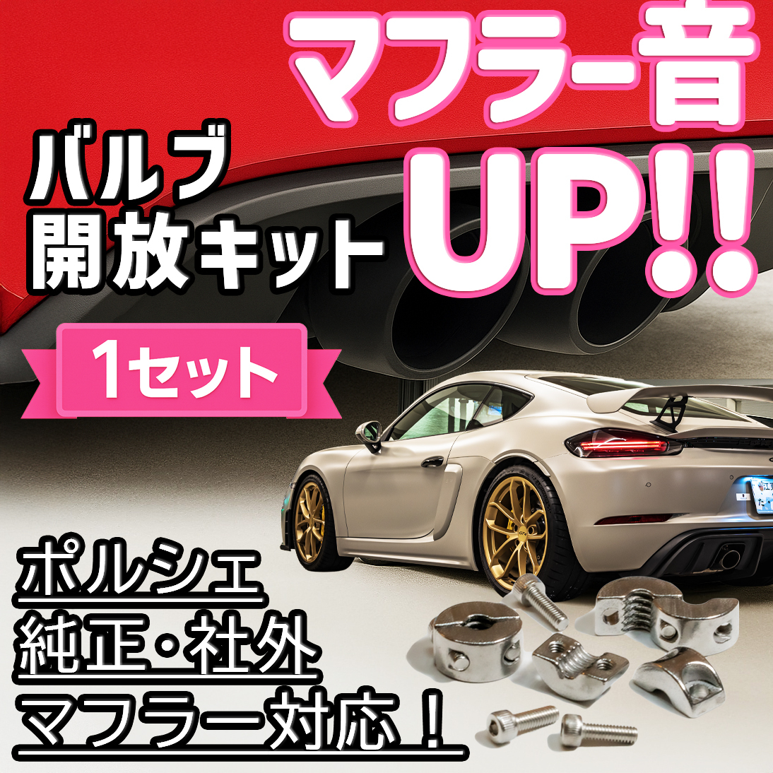 ポルシェ 簡単にマフラー音UP!? [1セット] スポーツエギゾースト PSE バルブ フラップ 可変 EBM バルブコンローラー 991 911 981 718 GT4 商品説明 ご覧いただきありがとうございます。 この商品は、以下のYoutubeにて紹介している商品です。 商品の詳細や、施工方法、施工によるマフラー音の違い等も紹介しております。 まずはこちらの動画をご覧ください。 ◆【商品の特徴】 こちらの商品は、ポルシェに装着されているPSE(ポルシェスポーツエギゾースト)、のバルブを常時開放状態に固定するためのアイテムです。 バルブコントローラー(Exhaust Bypass Module EBM)不要で、配線加工も一切不要です! バルブコントローラーを装着してしまうと、ポルシェセンターの保証が通らなくなってしまう為、ディーラーへ行くときには毎度数万円の工賃をかけて外さなければなりません。 こちらの商品であればご自身で取付・取り外しができますので、保証が残っている方・ポルシェセンターで整備をしている方でもお手軽にチューニングをお楽しみいただけます。 バルブコントローラーを検討中で、まずバルブOPEN時の音を確かめてみたい方にもおすすめです。 ※他メーカーの車種や社外マフラーについても、似たようなバルブのロッドがむき出しになっている負圧式バルブが装着されていれば、使用可能です。◆【こんな方におすすめ】 ポルシェのエキゾーストバルブを常時オープン(解放)状態にしたい方 バルブコントローラーを検討中で、まずバルブOPEN時の音を確かめてみたい方 DIYで簡単・激安でマフラー音を変えたい方 サーキットやイベント前にだけ音量アップしたい方(工具で簡単に脱着可能)◆【類似商品との違い】 ・Youtube説明欄に載せている通り、Amazonで販売されている他の物も紹介しておりますが、こちらの商品のほうが高品質・高耐久性でおすすめです! ・バルブのロッド(棒状のモノ)を固定する真ん中の部分がギザギザに加工されており外れ・滑りにくい。 ・2つのボルトで強力に固定できる。 ・Amazonのモノはいつの間にか締めが足りず取れてしまった、などのお声を頂いています。 ・ボルトも含めオールステンレス製で錆びにくい。(Amazonのものはスチール製で錆びることがあります)◆【ご購入前の注意事項】 ※装備されているバルブの数が、グレードによって異なります。 ※事前にご自身の車両を確認いただき、1つまたは2つご購入ください。 ※お得な2個セットの商品ページもご用意しています。 ※718ケイマン・ボクスターの場合、ベースグレードは1か所。GTS4.0, Spyder, GT4は2か所装着されています。 (S, GTSは情報が少なく把握できていません。恐らく1か所ですが、取付車両をご確認下さい。 また情報提供頂けますと、別ページにてお安くご提供します。 ※981ケイマン・981ボクスター、また991世代の911ではベースから2つ装着されています。 ◆【適合車種】 以下の車両に適合します。 ・スポーツエギゾーストの装備 且つ ・987 ケイマン・ボクスター ・981/718 ケイマン・ボクスター 全グレード(素 2.7 3.4 S GTS SPYDER GT4 ) ・981/718 ケイマンGT4 / スパイダー ・911(991/997/996世代)GT3 GT3RS含む(991.2 後期GT3RSのみ対応していません。後期GT3は対応しています) (・957 カイエン GTS) (・958.1 カイエン GTS) (・970パナメーラ S、ターボ) (・パナメーラ、カイエンは情報が少ないため確実ではありません。もし装着できそうな方で、装着後に指定する写真を送ってくださる方がいらっしゃいましたら質問欄よりご連絡ください。送料のみでご提供いたします。) ・その他、純正流用、または負圧式バルブを採用している社外マフラーを装着している車両 ・ポルシェ以外でも構造的に使用できるものであれば使用可能です。 ・992や上記に記載以外のカイエン・パナメーラ・マカン等は基本的に対応していません。 記載のグレードで対応していなかった場合には、指定の方法でご報告いただければ無料で返品対応させていただきます。 その他に関しては返品は承れません。◆【販売セット内容】 ・バルブ固定用具×1 (2セット販売ページもございますので、私の出品ページよりご覧ください。)◆【取り付けに必要な工具】 施工は5分程度、以下の工具があれば誰でも簡単に作業可能です: 必須 ・六角レンチ あると便利 ・手持ち電動ドライバー(VESSEL ボールグリップ等) 地面に近く狭い場所で作業するため手で回しにくいです。電動があるとかなり作業性が良いです。 ・タイヤスロープ or ジャッキ(必要に応じて。 車高を下げていた李、GT4/3等元から低い車種は特にあると便利です)◆【注意点】 ・この商品は負圧バルブ専用です。電動制御バルブには対応しておりません。◆【発送方法】 ・匿名配送にて配送します。 ・簡易包装での発送になります。 ・初期不良、また上記適合車種欄に記載の理由以外での返品は対応しておりません。◆【免責事項】 ・取り付けや使用によって生じた車両の不具合や損害については、いかなる場合も責任を負いかねます。 ・ご購入前に