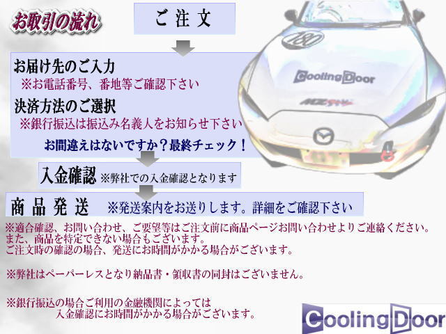 | お願い | 上記掲載画像のお取引の流れを最後までよくお読みください。 また、当社からのメールも必ずご確認ください。 ご注文いただいた時点でお取引開始となりますので、 お客様よりお届け先情報等のご入力・ご確認をお願い致します。 |