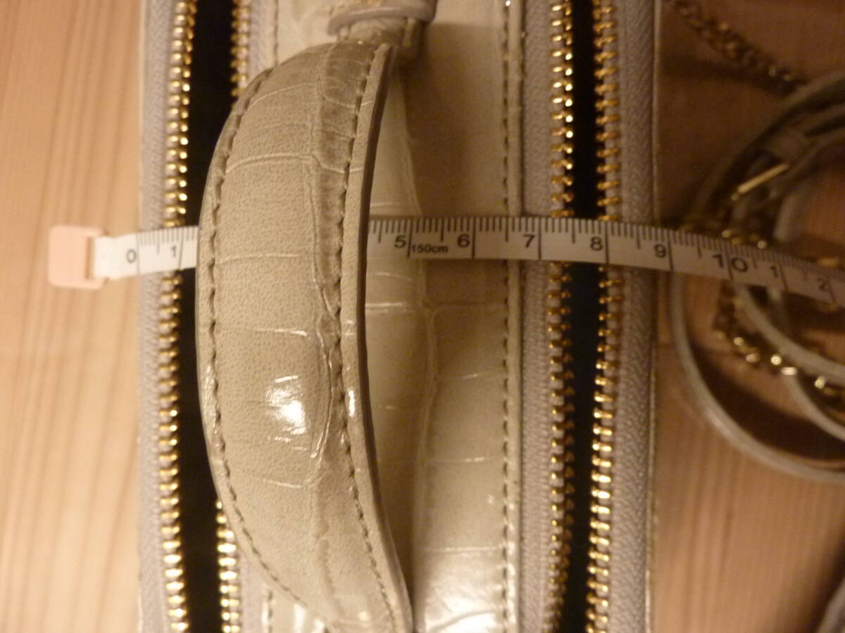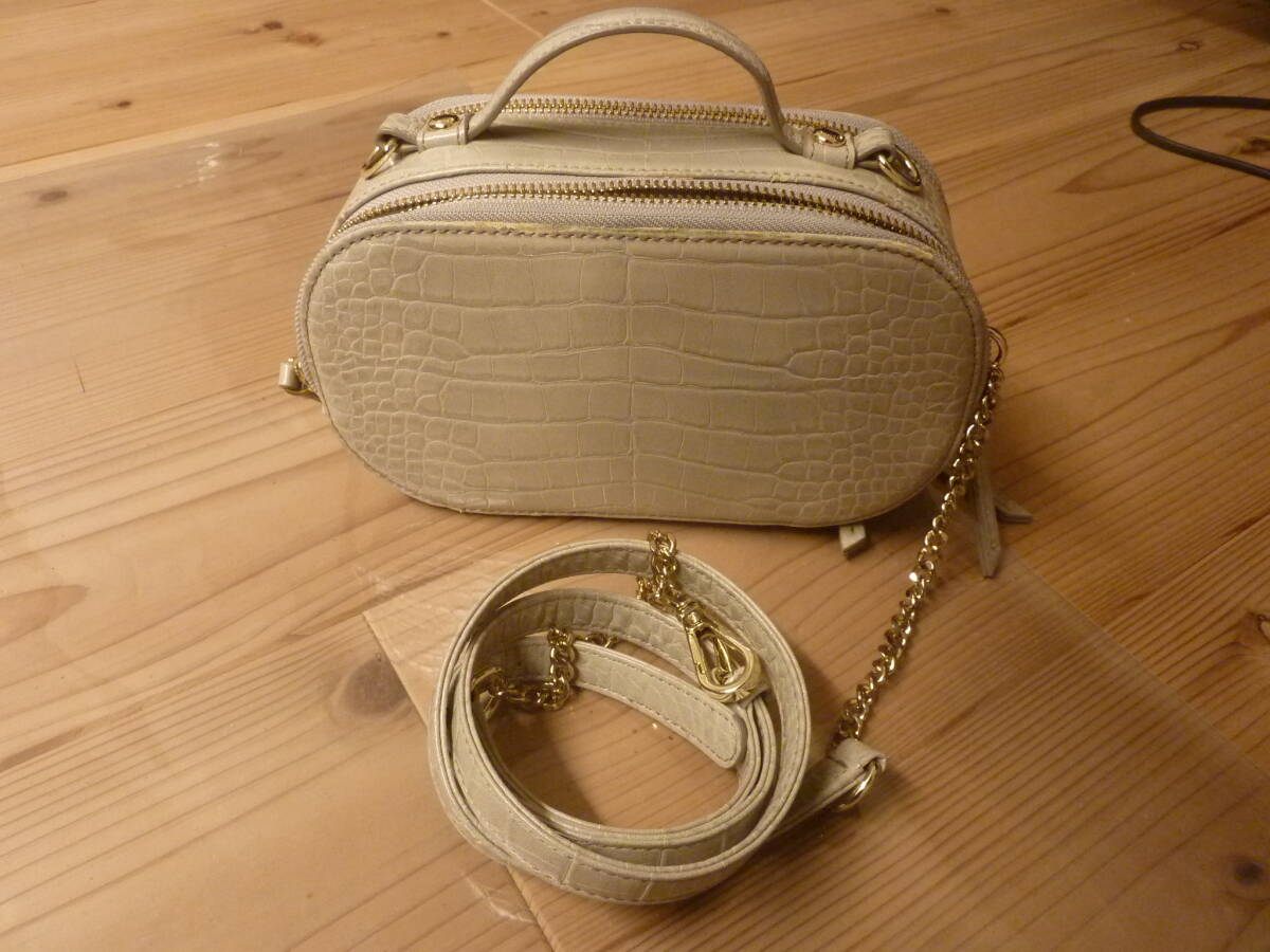 DIANA ベージュのクロコダイル風ハンドバッグ、ブルー内装、取り外し可能ストラップ付き。 - 色: ベージュ - 素材: クロコダイル風合成皮革 - 内装色: ブルー - ストラップ: 取り外し可能なチェーンストラップ - 形状: オーバル型 - ポケット: ファスナーポケットあり ご覧いただきありがとうございます。 カラー...ベージュ系 汚れ・破れなど...あり 汚れ・破れなど...なし あまり使っていない美品です。 大きさは 幅…約20㎝ 高さ…約11㎝ 奥行…約9cm