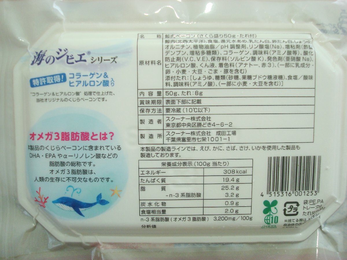♪原材料 ナガス鯨肉(北西太平洋、南氷洋)、還元水飴、食塩、植物油脂、卵たん白、乳たん白、リン酸塩(Na)、増粘多糖類、コラーゲン、Ph調整剤、甘味料(ソルビトール、アラビノース)、調味料(アミノ酸等)、酸化防止剤(V.C、V.E)発色剤(亜硝酸Na)、ヒアルロン酸、くん液、着色料(赤102) (添付タレ)[醤油(本醸造)、糖類(砂糖、果糖ブドウ糖液糖)、食塩、酸味料、調味料(アミノ酸等)、原材料の一部に小麦、大豆を含む)] 製造者:スクーナー株式会社 東京都中央区勝どき2-18-1