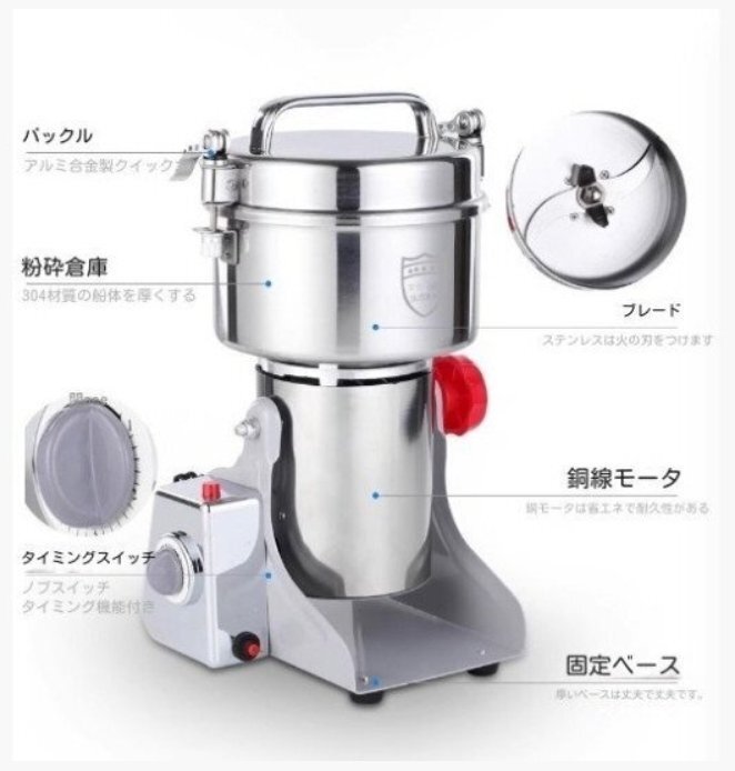 商品の詳細は以下表を参照ください。 ★状態:新品未使用 回転数: 36000r/m 粉砕容量:800g 出力:最大1800W 電圧:110V サイズ(約):20*20*36cm 重量(約):4.6kg 粉砕後メッシュ:70-300