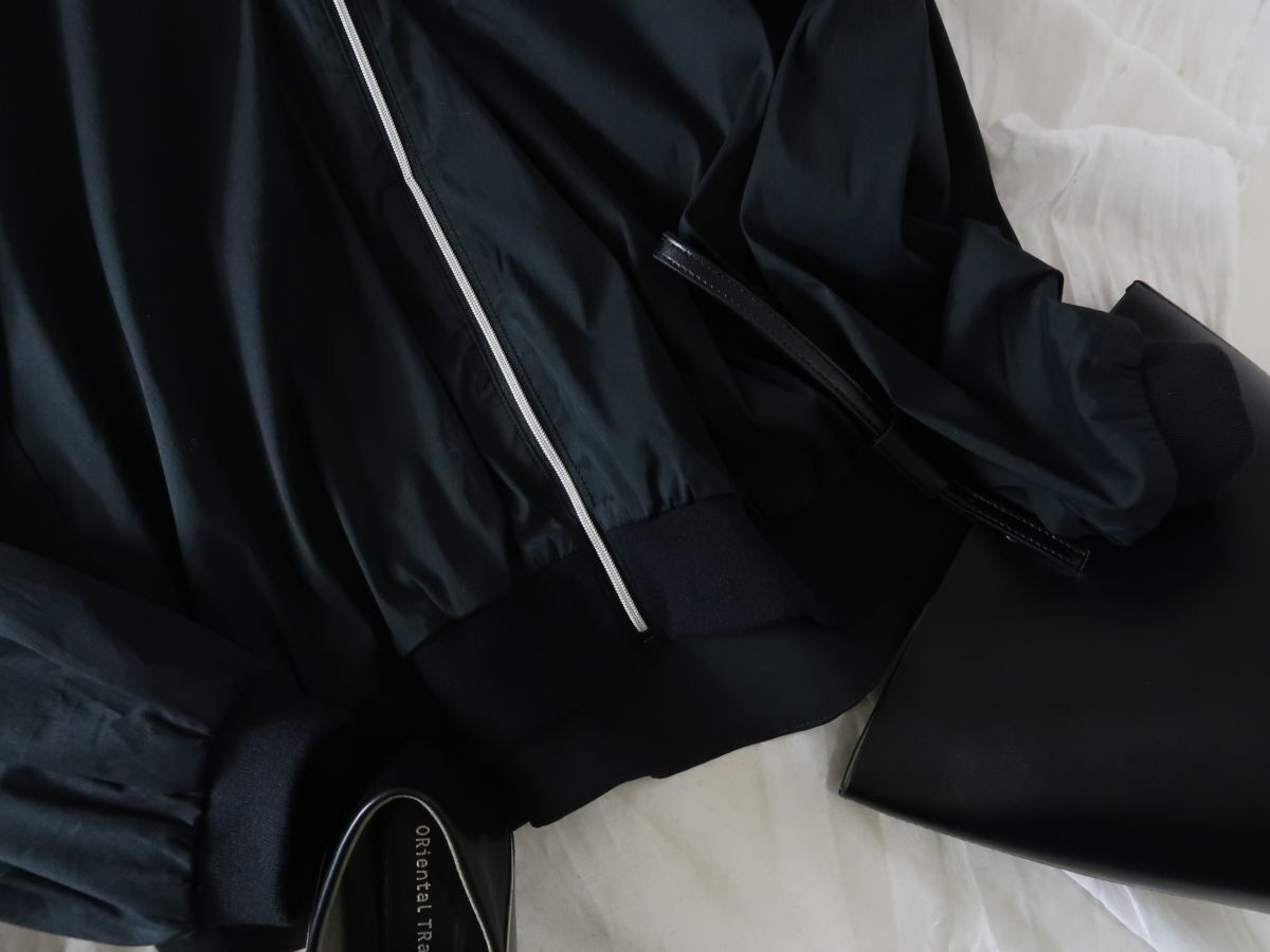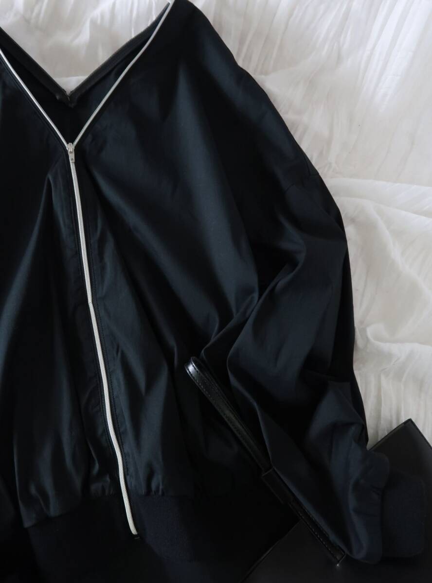 ストレッチの効いた程よい光沢感のある素材を使用したジャケット。 前後にV字を描くネックラインが、着こなしをすっきりと見せるポイント。 袖口や裾のリブがシルエットをほどよく引き締めます。 フロントジップ開閉。