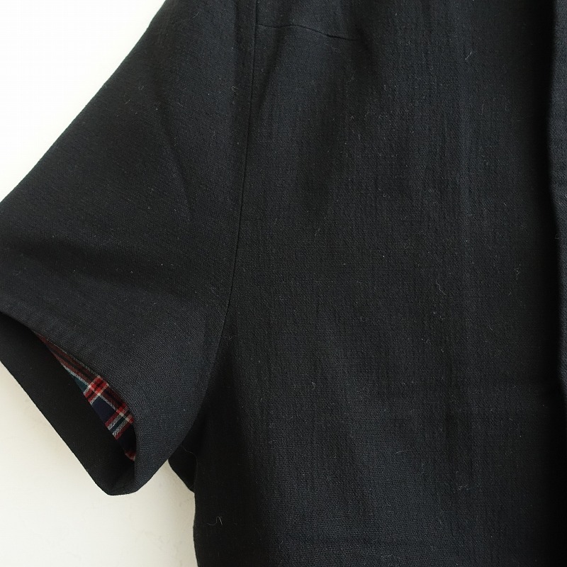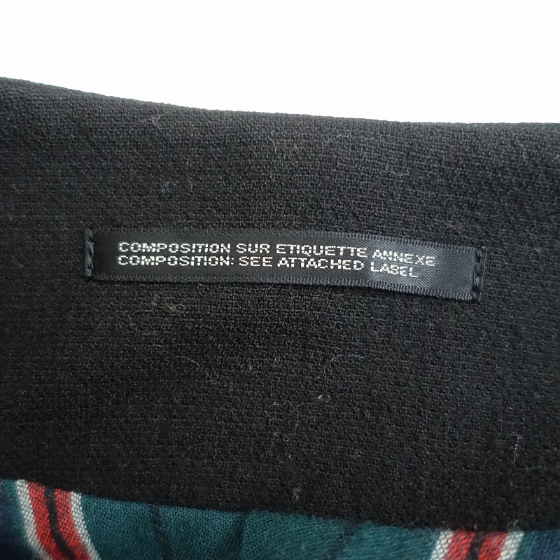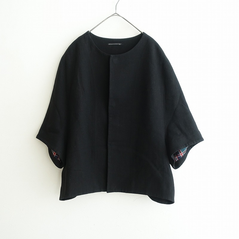 | Y’s composition see attached labelのノーカラージャケットです。カラーはブラックで、コットンウールの織り地で仕立てられ、チェック地の裏地付きです。スナップボタン開閉で、ゆったりとしたシルエットのデザインです。 |