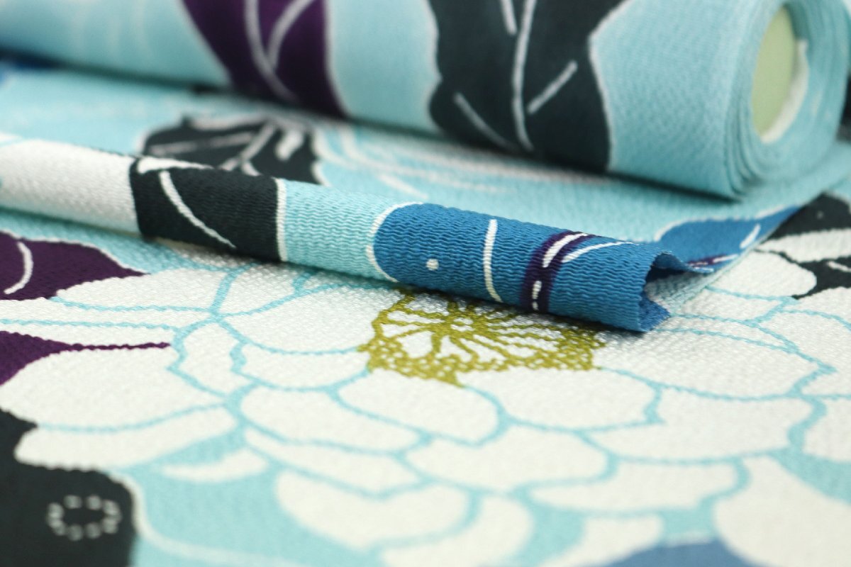 シボのたった上質な浜ちりめんの生地は、水色の上品なお色目でございます。